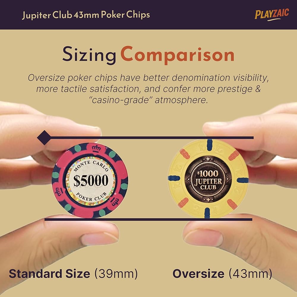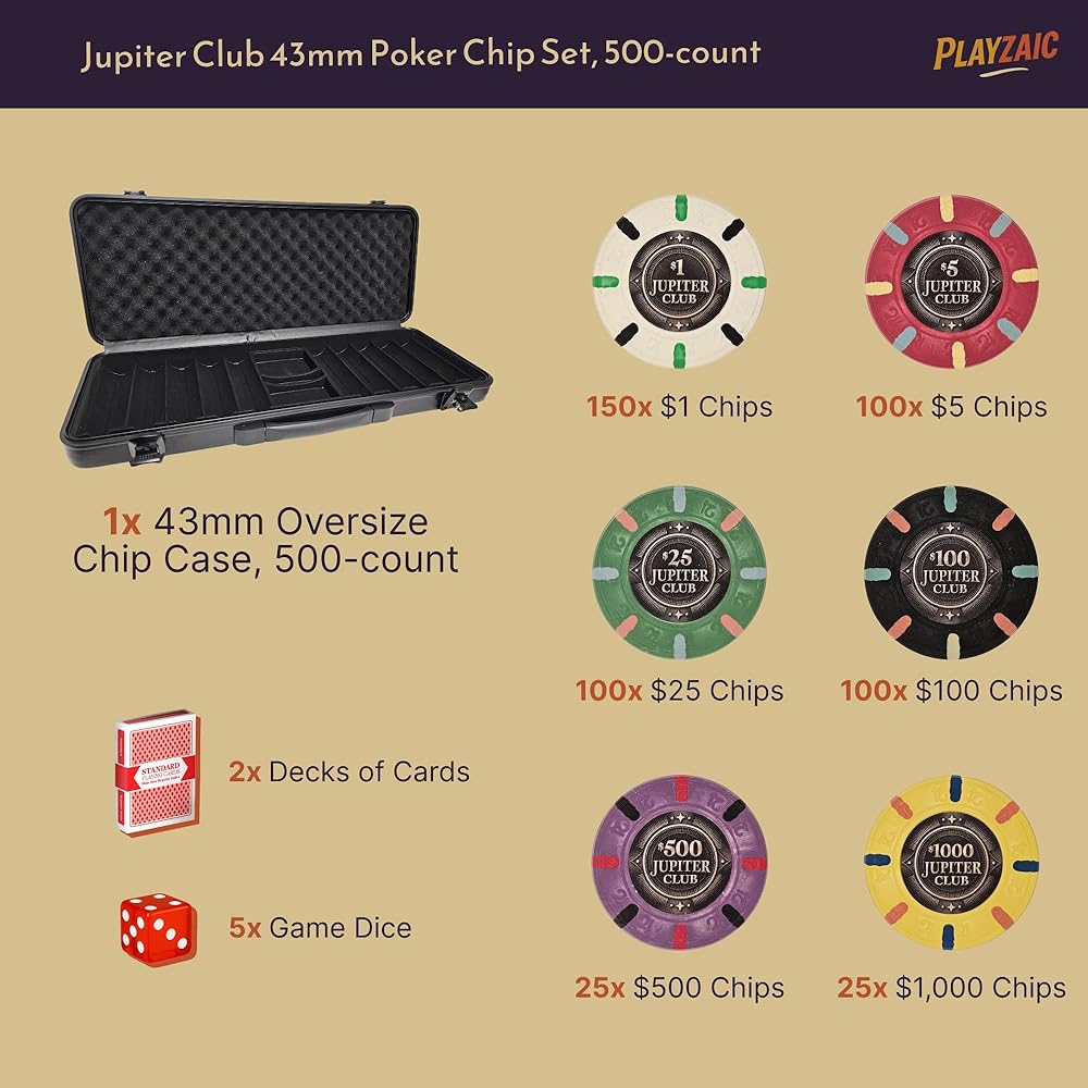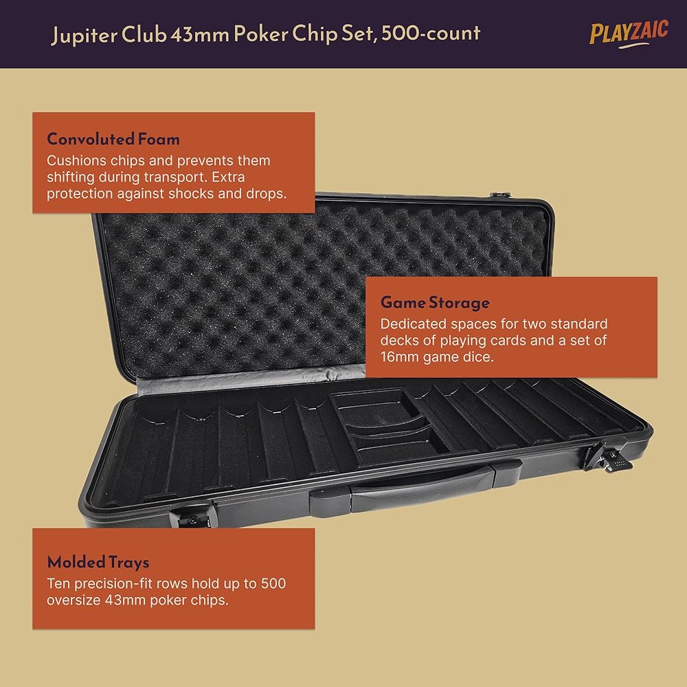 مجموعة شرائح بوكر من طين الكازينو بحجم 500 قطعة بحجم 43 مم من جوبيتر كلوب | 11 جرامًا من رقائق XL في حافظة واقية للقفل | إحساس فاخر من الطين بنسبة 100% للألعاب النقدية المنزلية والبطولات ذات الرهانات العالية