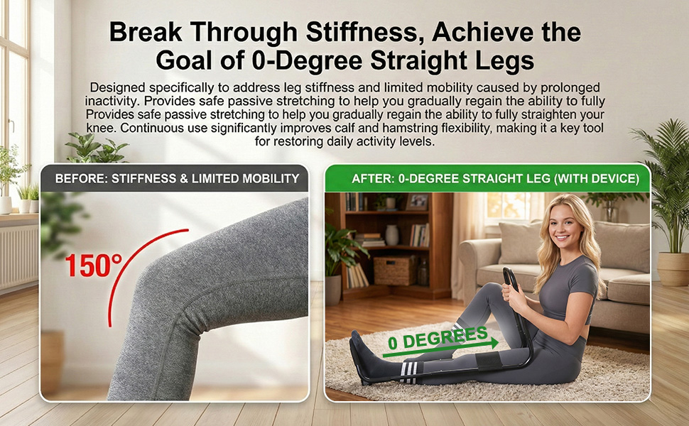 تحقيق تمديد كامل للساق والحركة: هل تعاني من الأرجل الصلبة أو الحركة المحدودة؟ تم تصميم جهاز تمديد الركبة الخاص بنا لتوفير تمدد آمن وسلبي لمساعدتك على استعادة الاستقامة بمقدار 0 درجة. يساعد الاستخدام المستمر على تحسين نطاق الحركة والمرونة في عضلة الساق وأوتار الركبة، مما يجعله أداة أساسية لروتين التنقل اليومي بعد فترات من عدم النشاط.