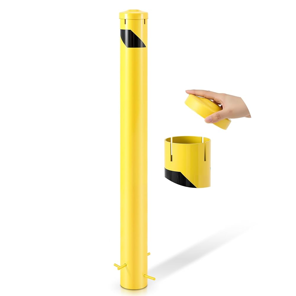 قطعة واحدة من Blulu عمود حاجز أمان للصب في مكانه، 46 بوصة، حاجز فولاذي شديد التحمل 4-1/2 بوصة OD مع غطاء قابل للإزالة، موقف سيارات مطلي بمسحوق أصفر وحاجز مروري