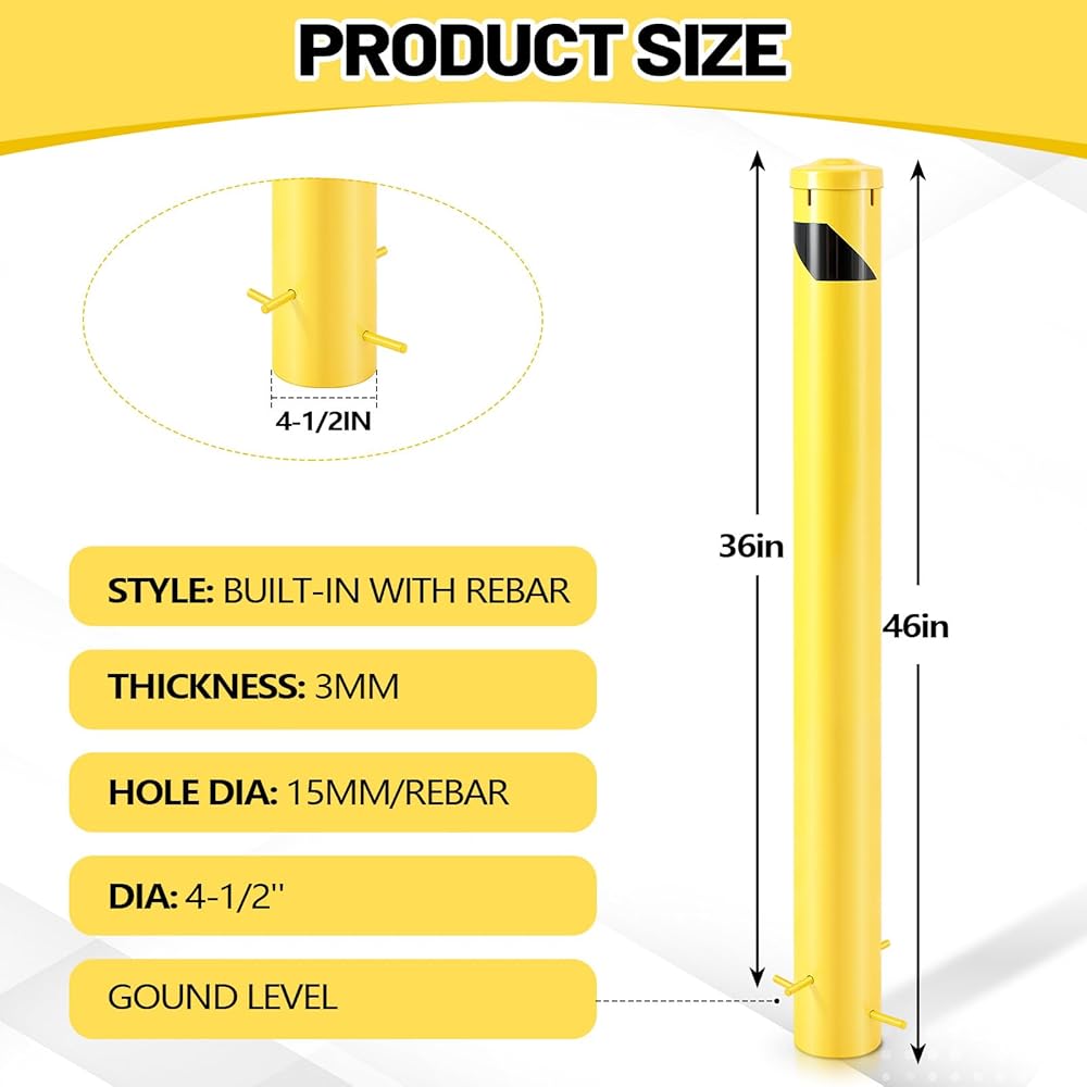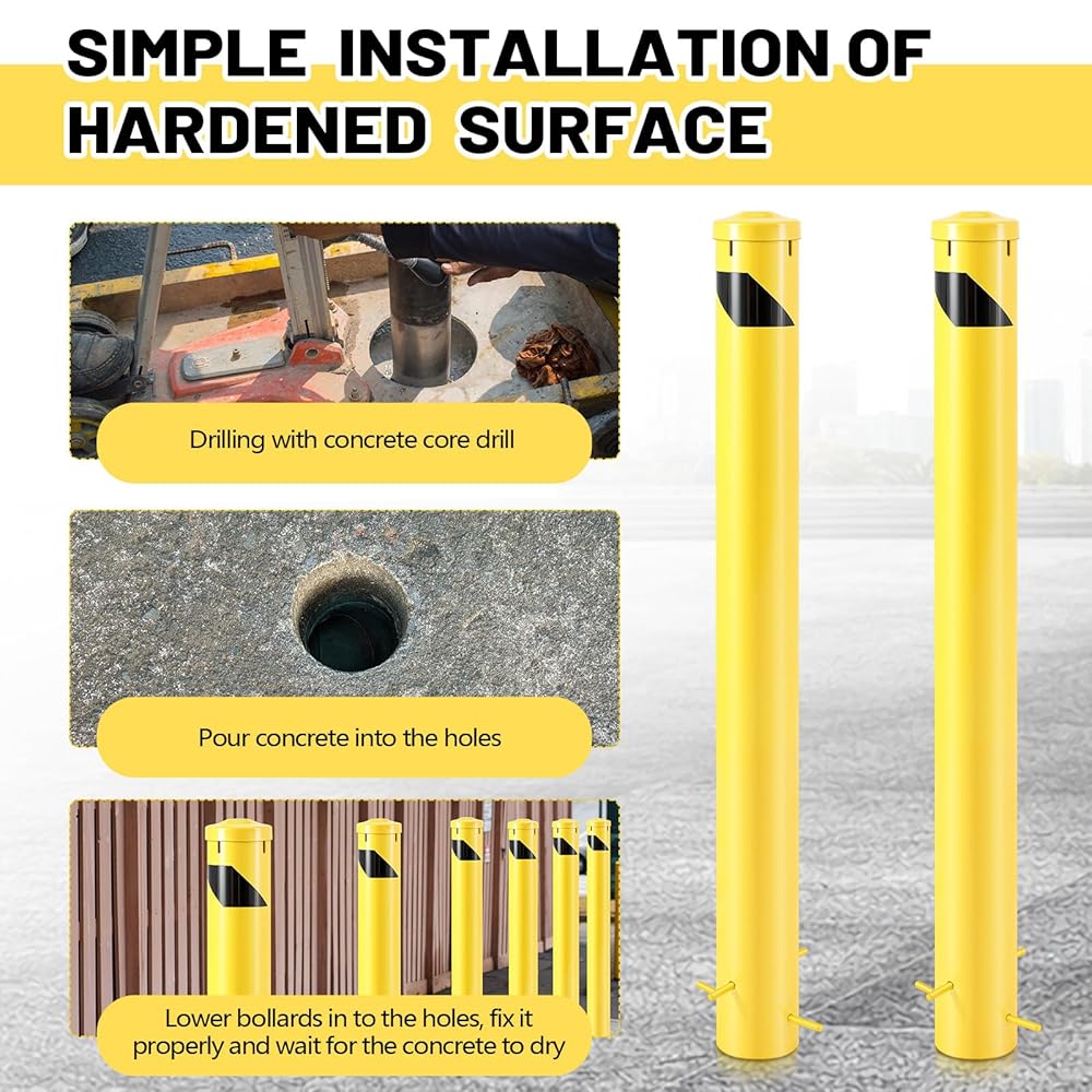 Easy to Install: can be installed to the depth and width required, including a crossbar to fix the newly poured cement to stabilize the parking bollard; This safety bollard is ideal for new construction or where a designated area needs to be created