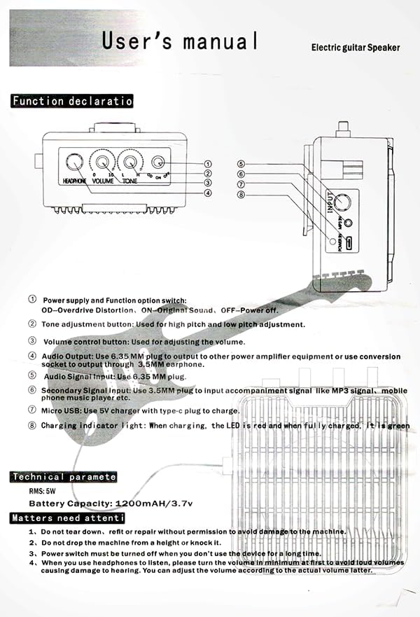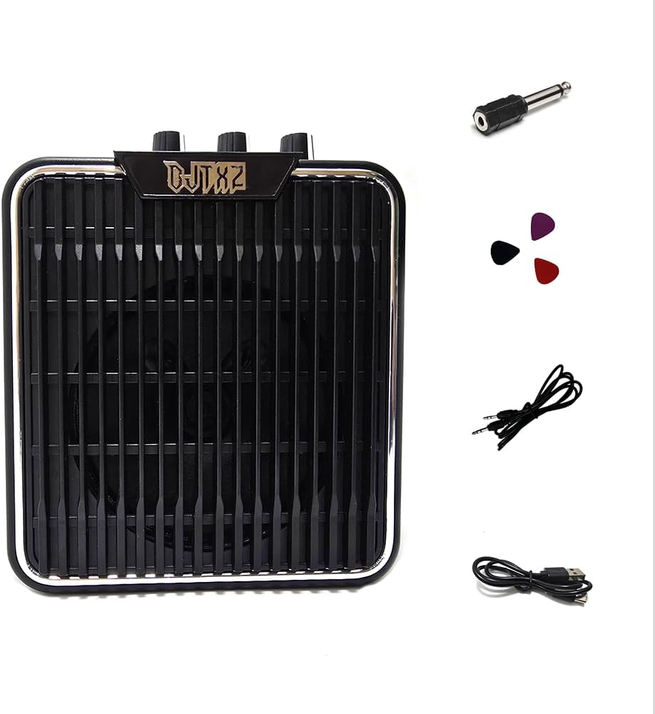 Product Description 🎸 5W Rechargeable Electric Guitar Amp | Portable for Outdoor & Practice A portable solution designed for guitarists, delivering clear and full sound with 5W of power. The built-in rechargeable battery frees you from power cords, letting you enjoy playing anywhere, anytime. ✨ Key Features Rechargeable Long-Lasting Battery: Built-in 1200mAh lithium battery with Type-C charging port. Enjoy hours of continuous play on a full charge, perfect for street performances and outdoor camping trips. 5W Precision Power: Ideal for personal practice and small gigs, with clear, distortion-free sound—crisp highs and solid lows. Ultra-Portable Design: Lightweight body with anti-slip stand. Easily fits in your backpack or stands securely on a gig bag or table, adapting to any scenario. Multi-Function Connectivity: Supports direct guitar input and includes a headphone jack for silent late-night practice without disturbing others. 🎯 Ideal For ✅ Daily personal practice & bedroom silent playing ✅ Street jamming & outdoor camping performances ✅ Small gatherings & music teaching demonstrations 📦 Package Includes 5W Rechargeable Electric Guitar Amp × 1 Type-C Charging Cable × 1 User Manual × 1 3.5mm male-to-male audio cable × 1, guitar picks × 3, adapter × 1