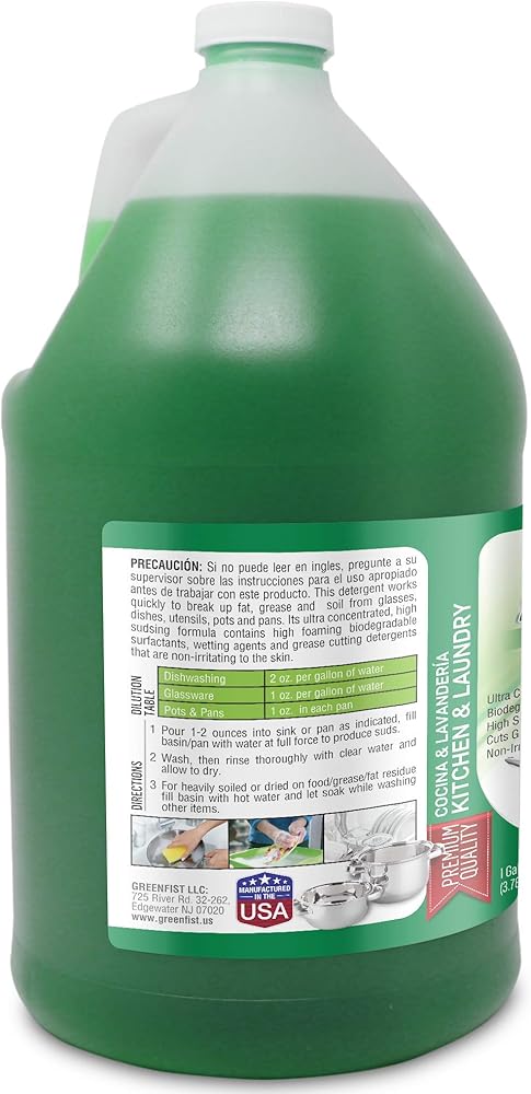• ULTRA CONCENTRATED - GreenFist Dish Soap uses ingredients such as Surfactant Blend, coco amide, fragrance, and Dye-Brilliant Green all optimally concentrated on enhancing the cleansing power of the dish wash solution.