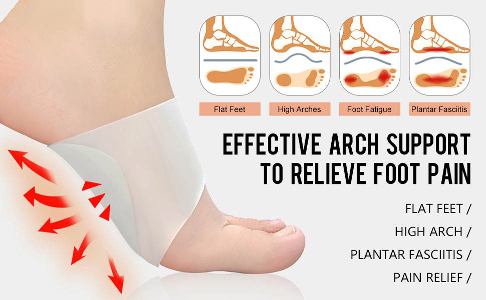 رعاية مريحة للقدم: توفر وسادة دعم قوس القدم المصنوعة من الجل الناعم ضغطًا لطيفًا ودقيقًا على قوس القدم. مع ضمادة السيليكون للتثبيت الآمن، فهو يوفر ملاءمة متوسطة، مما يسمح لك بالشعور بالراحة أثناء الوقوف والمشي، وقل وداعًا للأحاسيس الضيقة والمقيدة