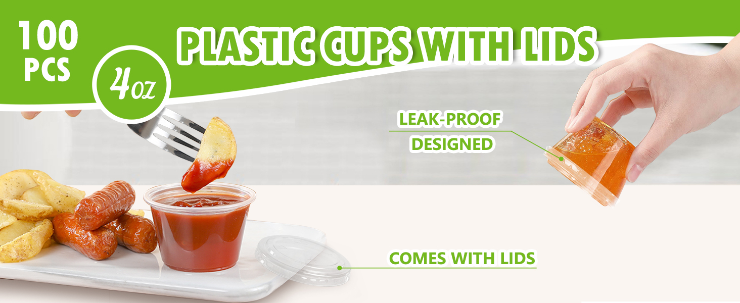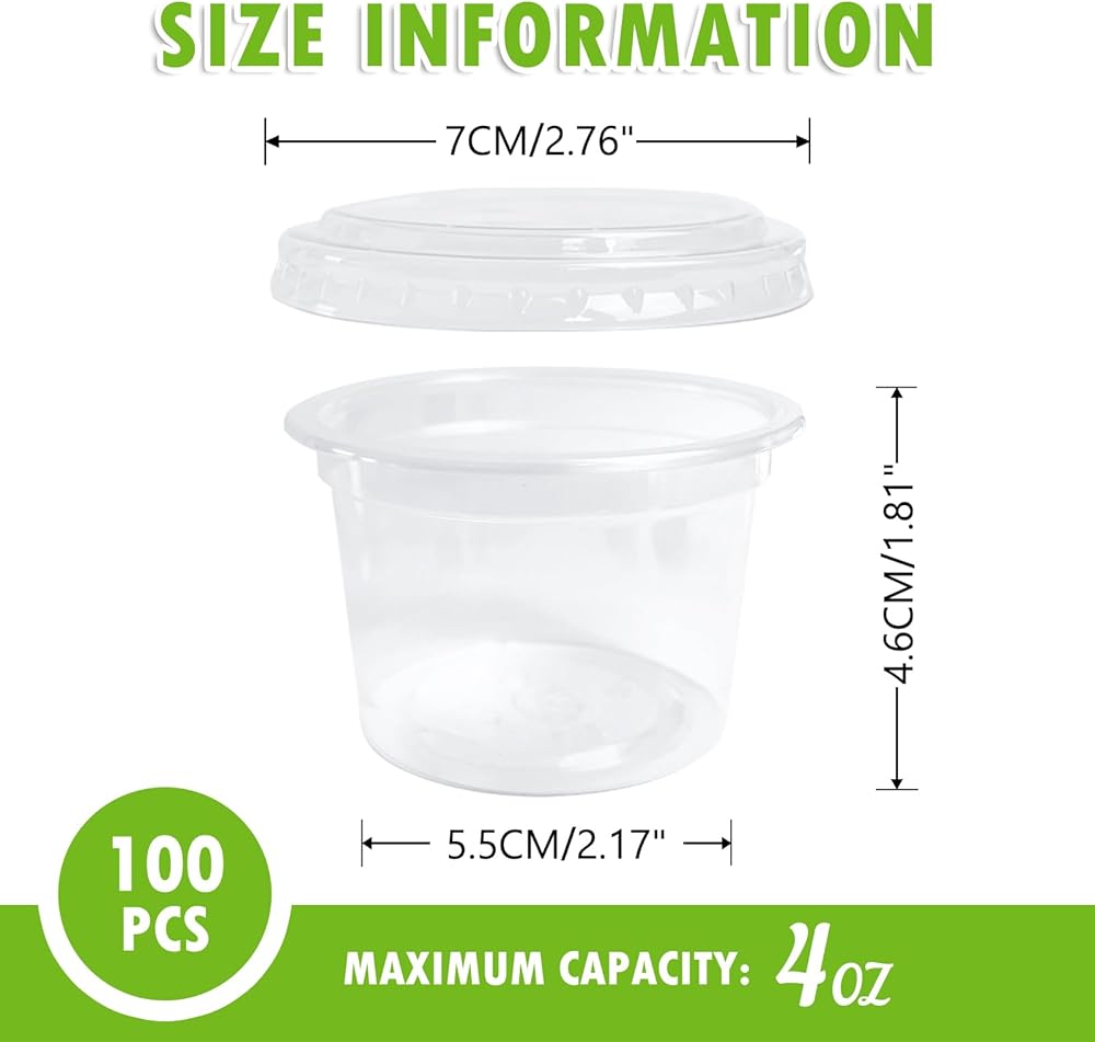 تتضمن العبوة: تحتوي كل عبوة على 100 قطعة من الأكواب البلاستيكية بأغطية سعة 118 مل، بسعة عملية وكميات كافية لتلبية احتياجاتك اليومية. استمتع بالراحة والكفاءة من خلال وجود ما يكفي من حاويات الصلصة في متناول اليد لأي تجمع أو مشروع طهي