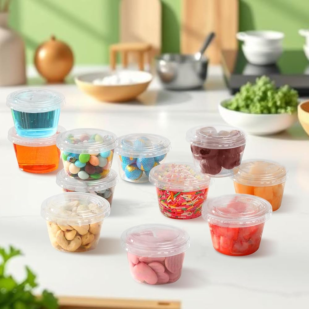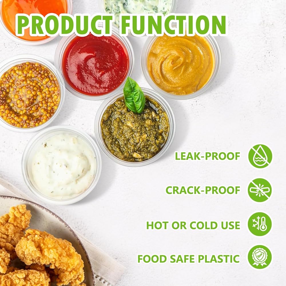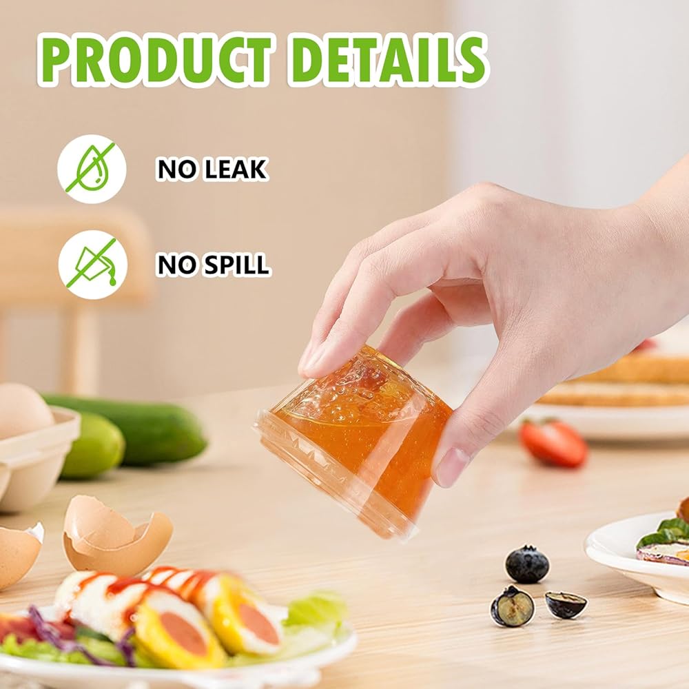 100 قطعة من أكواب البلاستيك مع أغطية، حاويات شفافة للاستعمال مرة واحدة لتتبيل السلطة لتحضير الوجبات الخفيفة، أكواب صغيرة مضادة للتسرب من الجيلي وأكواب صلصة غمس التوابل