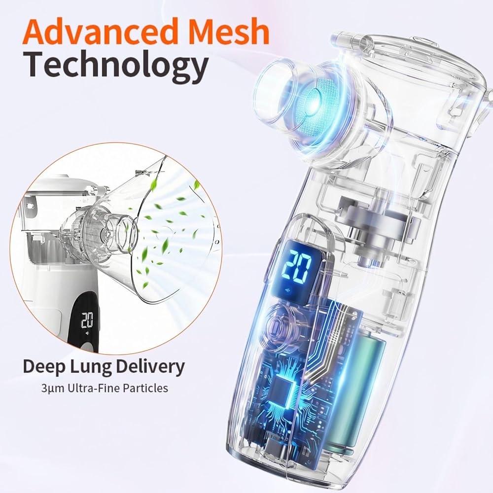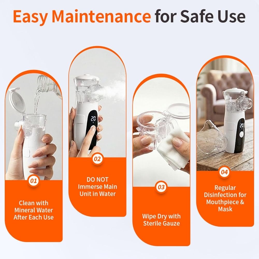 Safe & Easy to Maintain: The detachable medicine cup features a PUSH button release for quick disassembly and easy cleaning without touching the delicate atomizing plate, ensuring long-lasting performance. Important: For optimal performance, use mineral water or saline solution—avoid distilled/purified water or oily liquids as they may affect the mesh function.