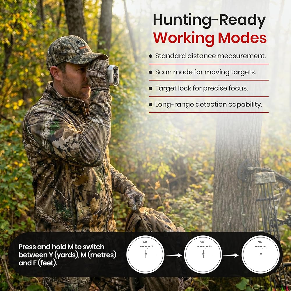 سهلة الاستخدام - بطارية USB-C القابلة لإعادة الشحن وإيقاف التشغيل التلقائي يبقيها جاهزة بعد الجولة. يعمل الجسم خفيف الوزن والبصريات الحادة مع قرص التركيز البؤري والتبديل السريع للوحدة (ياردة/متر/قدم) على تبسيط كل لقطة.