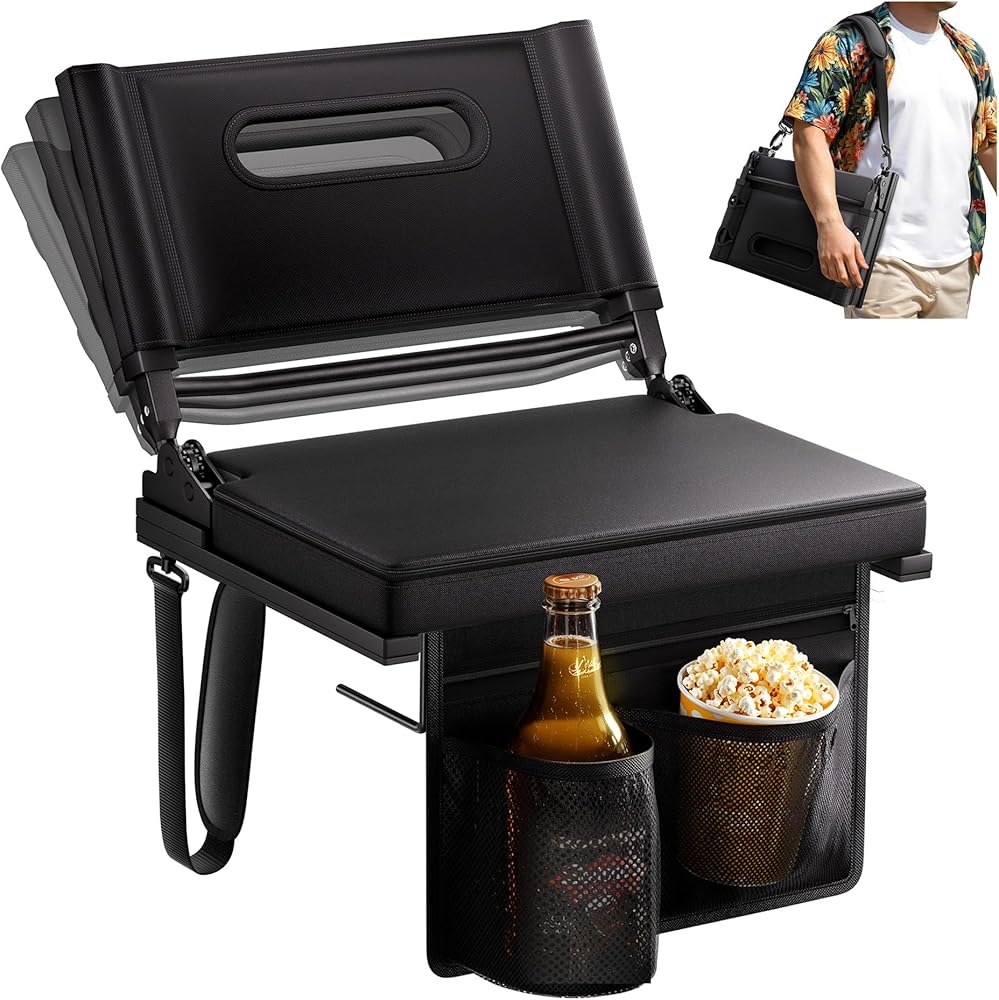 مقاعد الاستاد مع دعم خلفي للمبيض، مقعد وسادة سميك قابل للحمل بخمسة زوايا وارتفاع قابل للتعديل مع حقيبة تخزين حامل أكواب، يتضمن حزام الكتف، يستخدم للأحداث الرياضية والحفلات الموسيقية