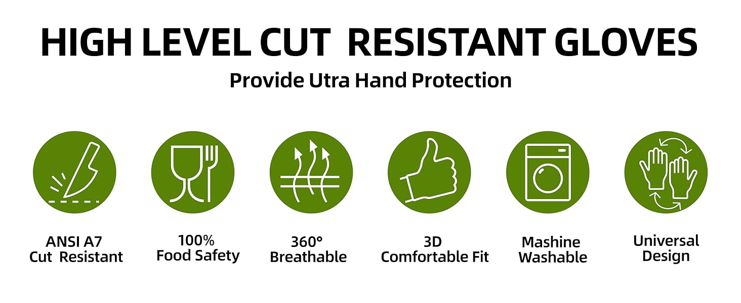 6.متعدد الأغراض: حافظ على سلامة عائلتك أثناء مهام المطبخ (تحضير الطعام، وقشر المحار، ونحت اللحوم، وتقطيع اليوسفي، وتقطيع الخضار، وتقشير الفاكهة) والمشاريع التي تصنعها بنفسك مثل الأعمال الخشبية أو البستنة. تحقق قفازاتنا المقطوعة من الدرجة الغذائية التوازن المثالي - راحة خفيفة الوزن تلبي مقاومة القطع ANSI A7 لمنع 90% من الإصابات دون التضحية بالقبضة أو الحركة