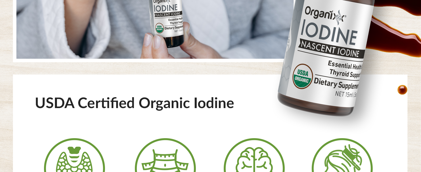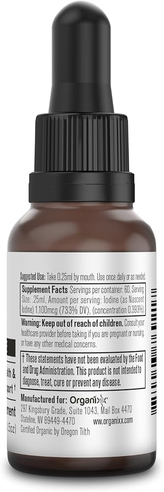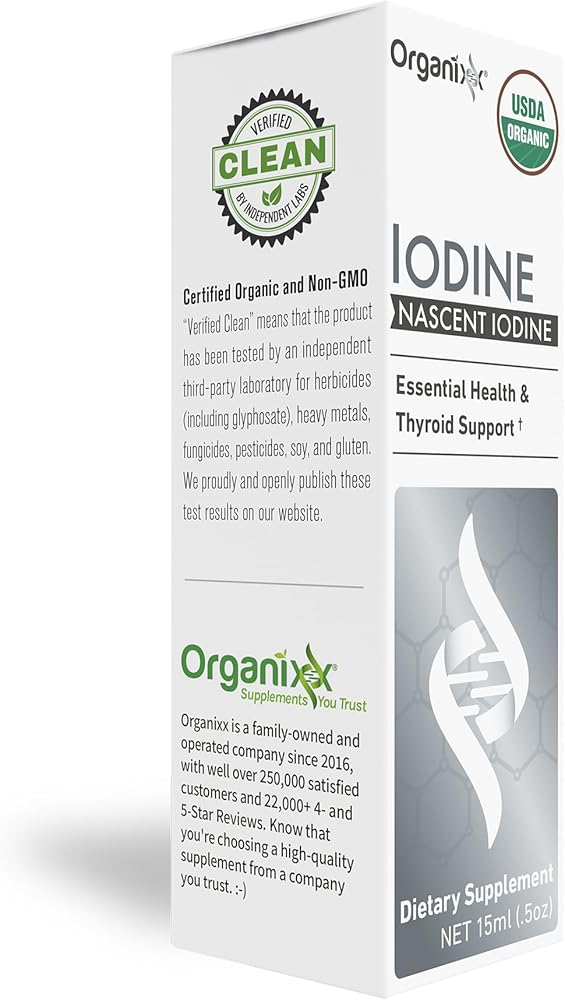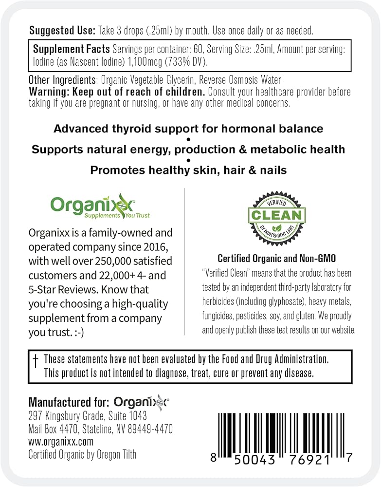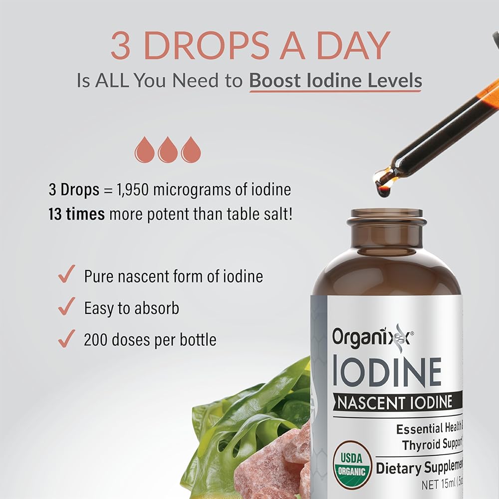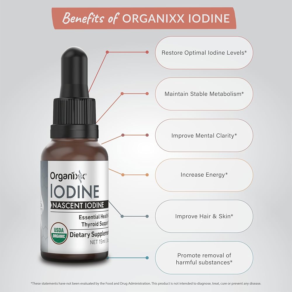 قطرات اليود العضوية النقية: Organixx Iodine هو مكمل اليود السائل الناشئ العضوي التابع لوزارة الزراعة الأمريكية في زجاجة مريحة بحجم 15 مل مع 60 وجبة تقريبًا. توفر كل قطرة 650 ميكروجرام من اليود في شكل نظيف ومتوفر بيولوجيًا مصمم لاستكمال روتينك الصحي اليومي.