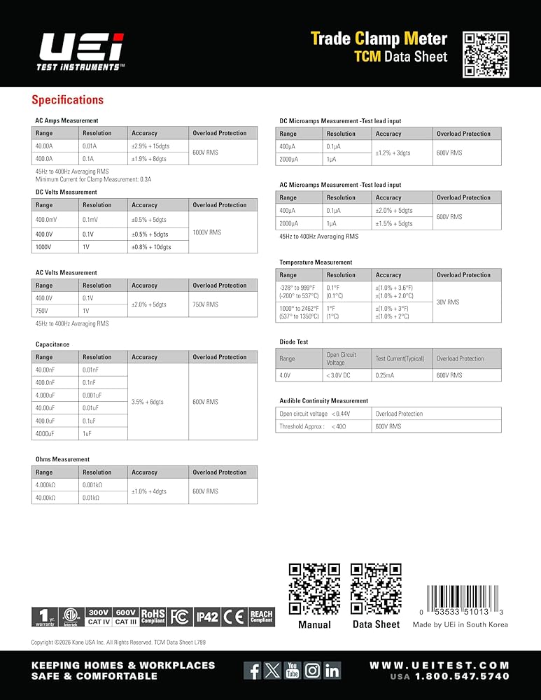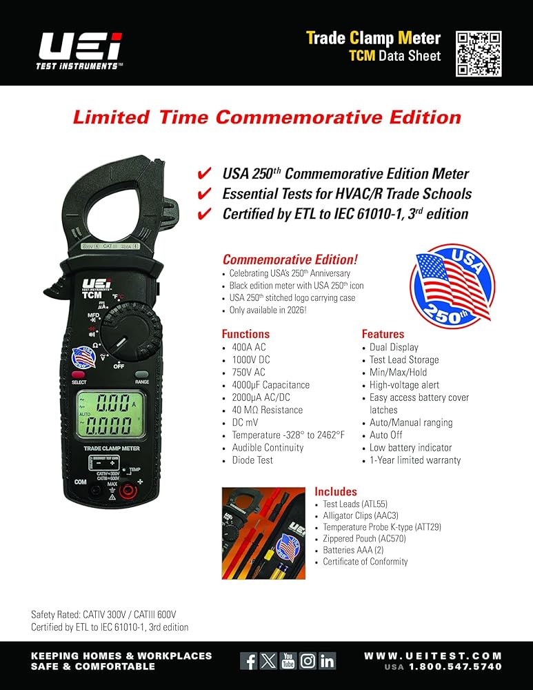 Our UEi Trade Clamp Meter celebrates America's 250th anniversary with this commemorative edition version 400A entry-level HVAC/R clamp meter offering standard testing functionality including resistance, capacitance, DC microamps, and temperature. TCM includes a set of standard test leads, threaded alligator clips for hands-free testing, and a zippered carrying pouch.