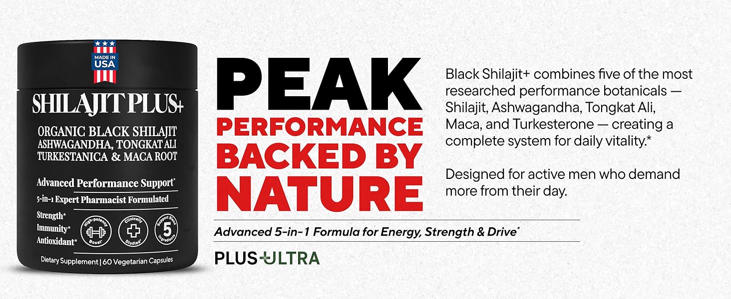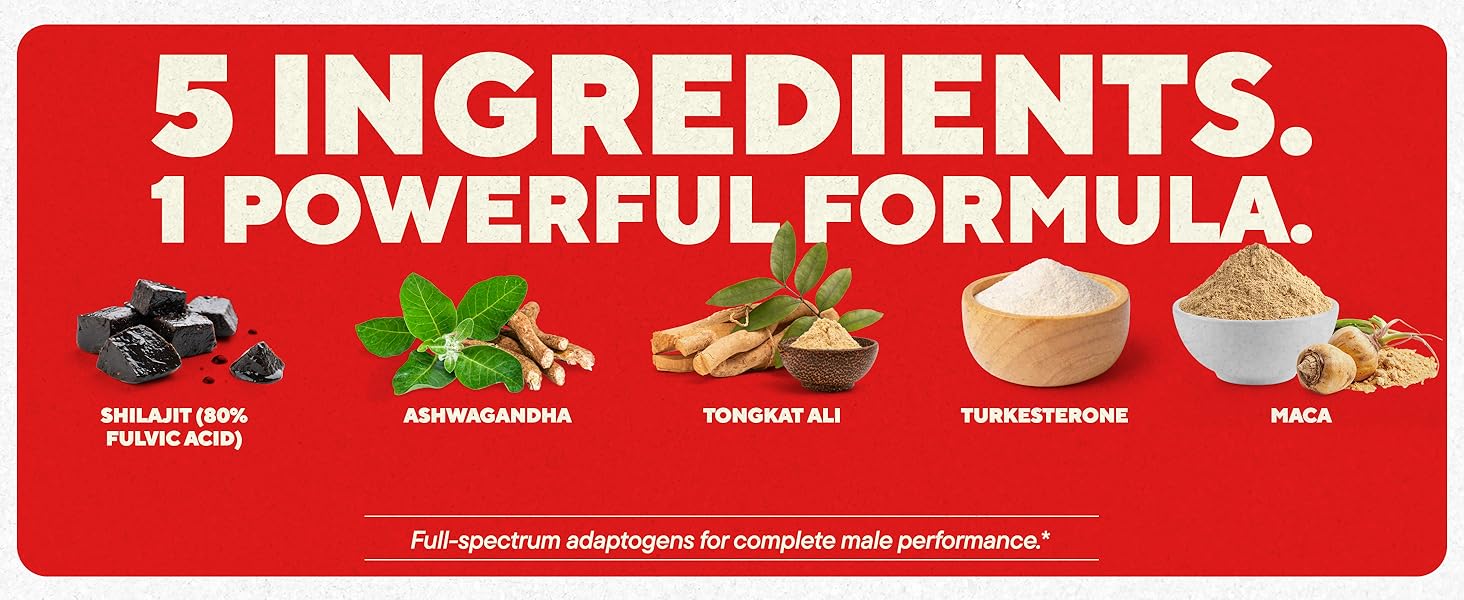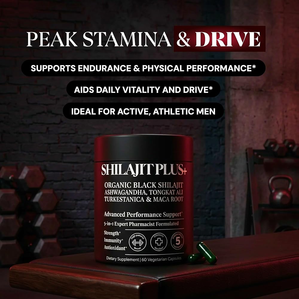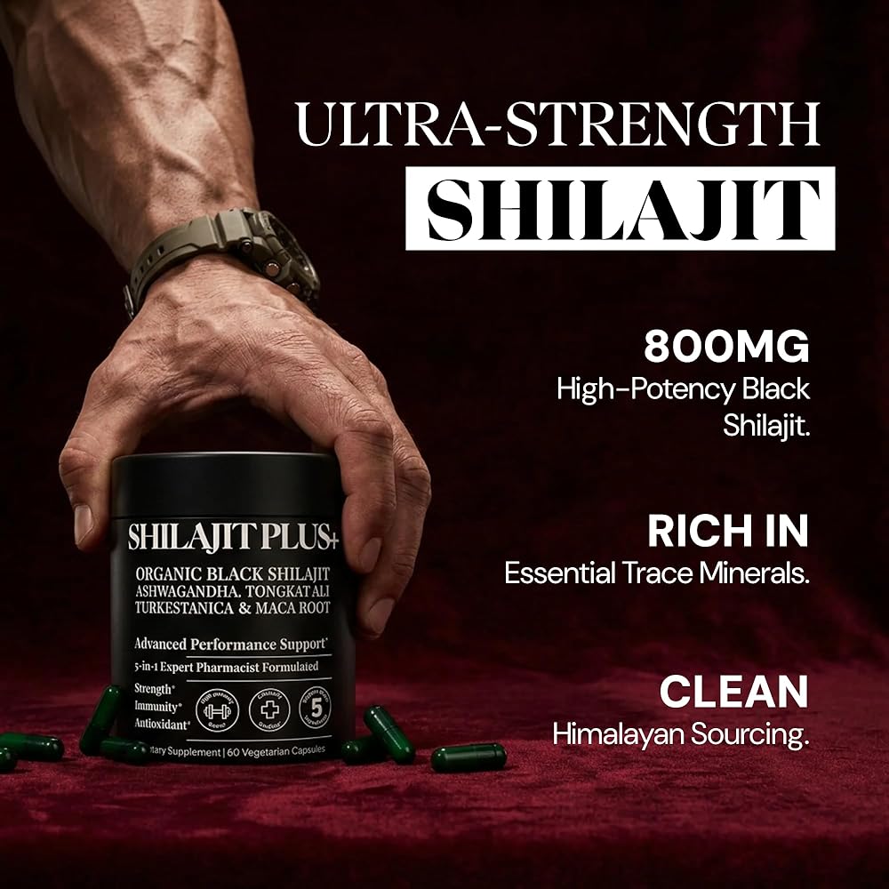 • 𝟓-𝐈𝐍-؟ 𝐏𝐄𝐑𝐅𝐎𝐑𝐌𝐀𝐍𝐂𝐄 𝐂𝐎𝐌𝐏𝐋𝐄𝐗: يجمع بين الشيلاجيت الأسود العضوي (80% حمض الفولفيك) مع أشواغاندا، وتونغكات علي، وأجوغا تركستانيكا، وجذور الماكا. دعم كامل للطاقة والقدرة على التحمل والهرمونات.*