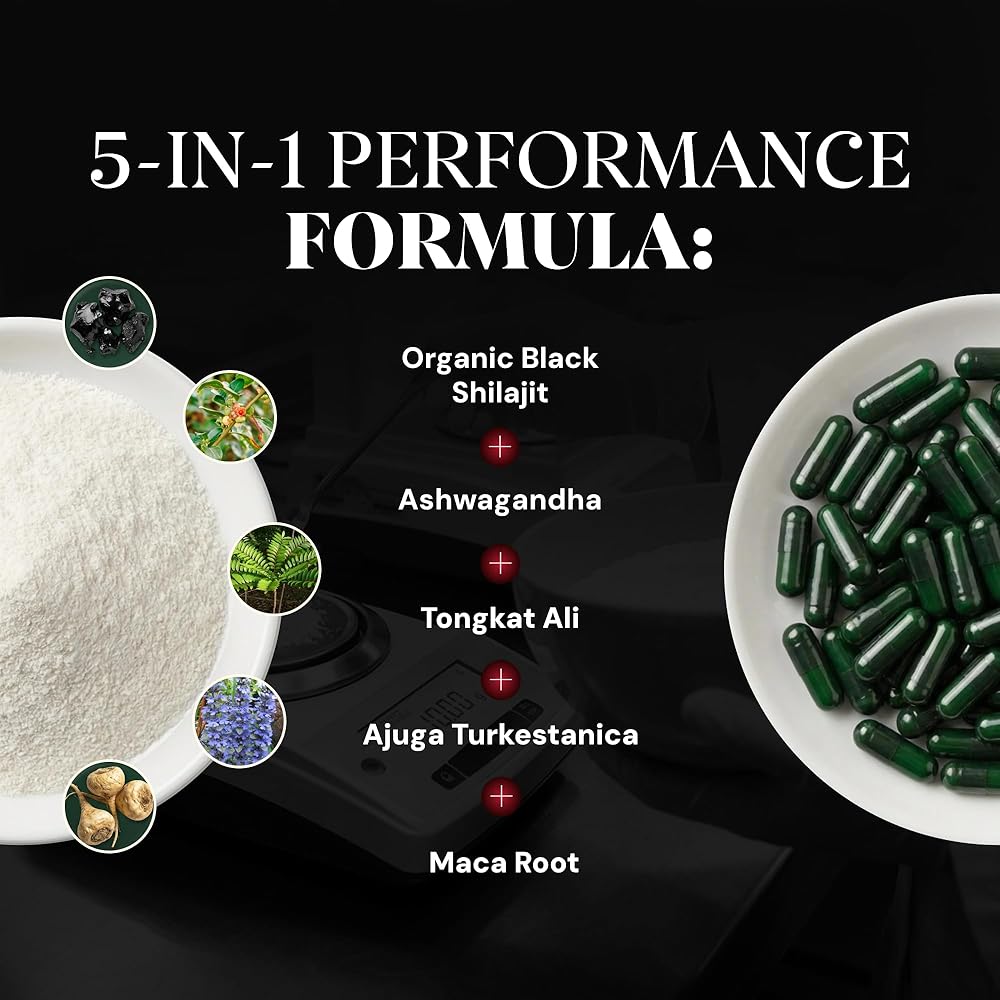 شيلاجيت الهيمالايا 5 في 1 للرجال والنساء – 1250 ملجم | اشواغاندا، تونغكات علي، جذور الماكا والتركستيرون – 80% حمض الفولفيك – الطاقة والتستوستيرون والحيوية، (60 كبسولة نباتية)