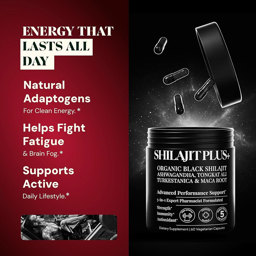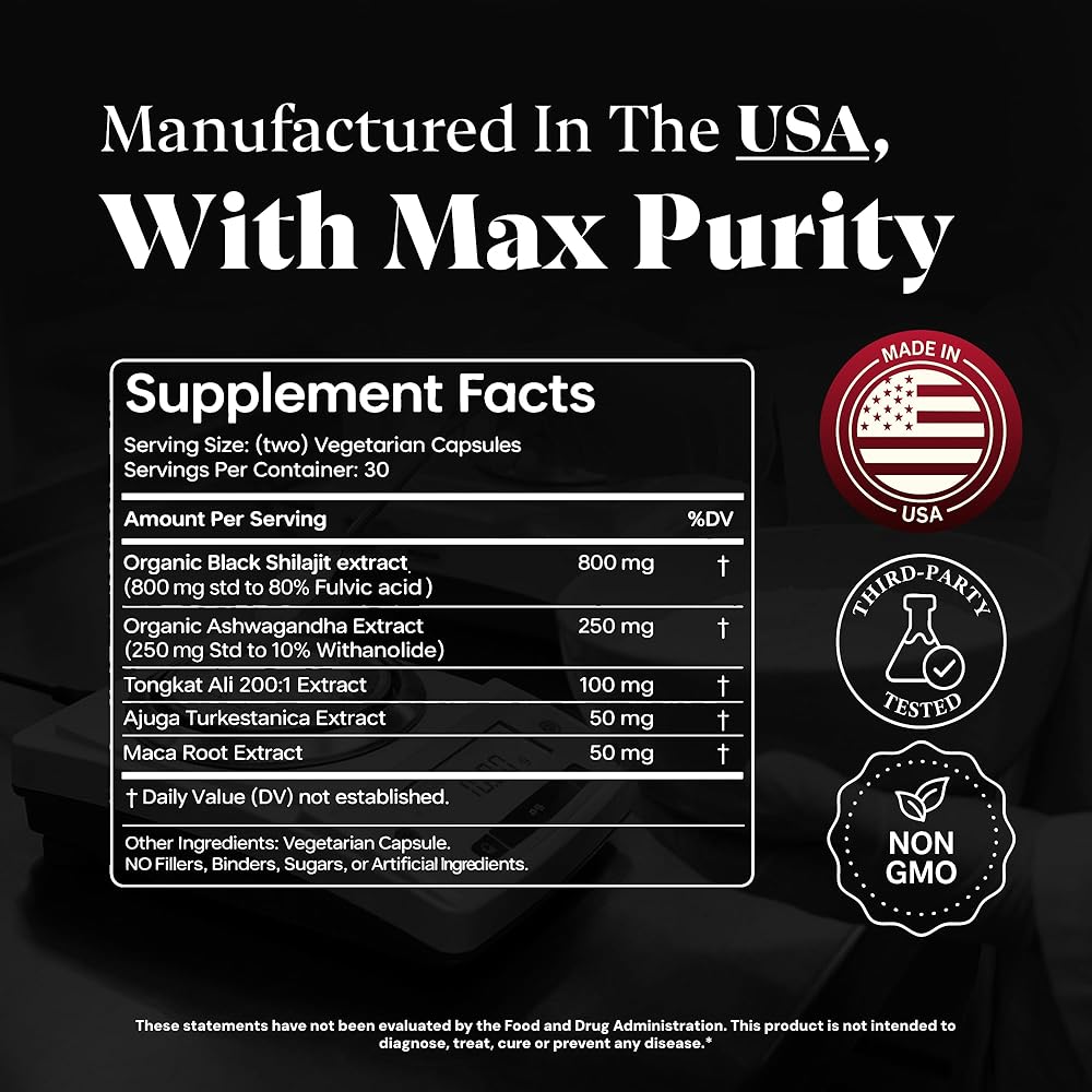 • 𝐇𝐈𝐆𝐇-𝐏𝐎𝐓𝐄𝐍𝐂𝐘 𝐒𝐇𝐈𝐋𝐀𝐉𝐈𝐓 𝐄𝐗𝐓𝐑𝐀𝐂𝐓: 800 ملغ من النقي شيلاجيت الهيمالايا الأسود موحد بنسبة 80% من حمض الفولفيك - غني بالمعادن النزرة والمواد المتكيفة التي تعزز الطاقة والقدرة على التحمل والتعافي بشكل طبيعي.*
