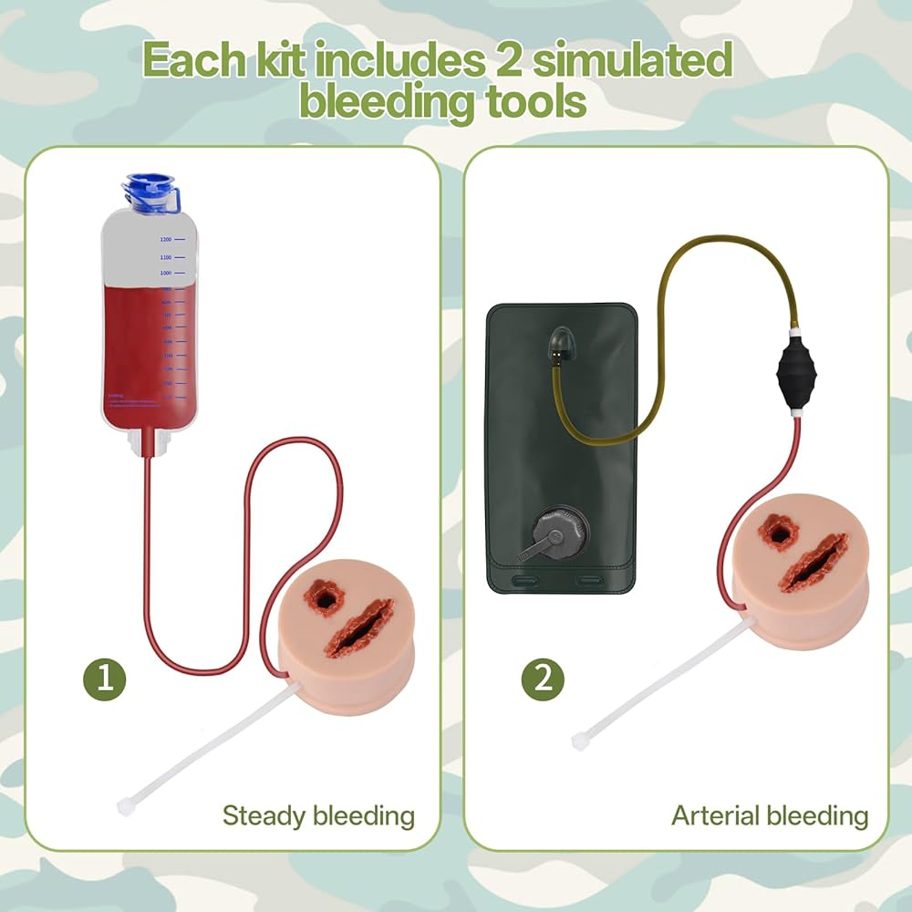 Dual Simulation: Stop the bleed kit features two bleeding modes - steady flow and arterial patterns for comprehensive wound management practice. The featured arterial bleeding system is designed to simulate arterial bleeding and control bleeding speed, with one way valve, it can prevent faux blood going backwards.