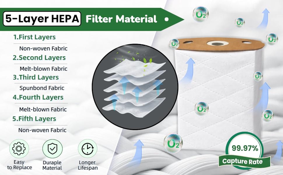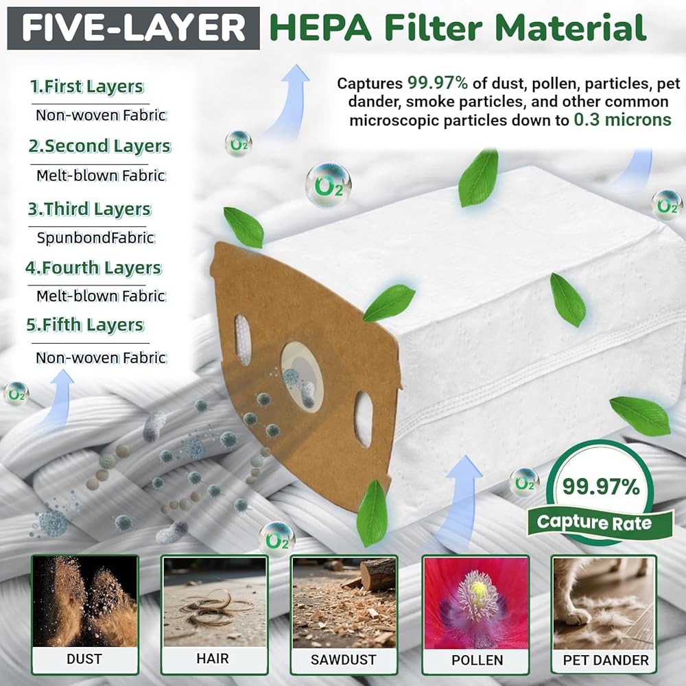✅ ترشيح فائق: مع تصميم من 5 طبقات، تعمل هذه الحقيبة العلبة بكفاءة. الطبقة الخارجية غير المنسوجة تلتقط الشعر ونشارة الخشب، بينما تحجز الطبقة الداخلية HEPA 99.97% من الجزيئات الصغيرة. إنه يحمل المزيد من الغبار، مما يقلل من تردد الكيس - يتغير