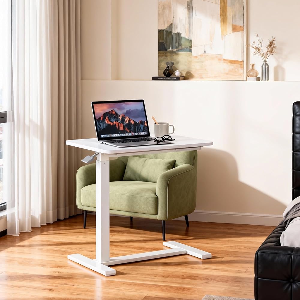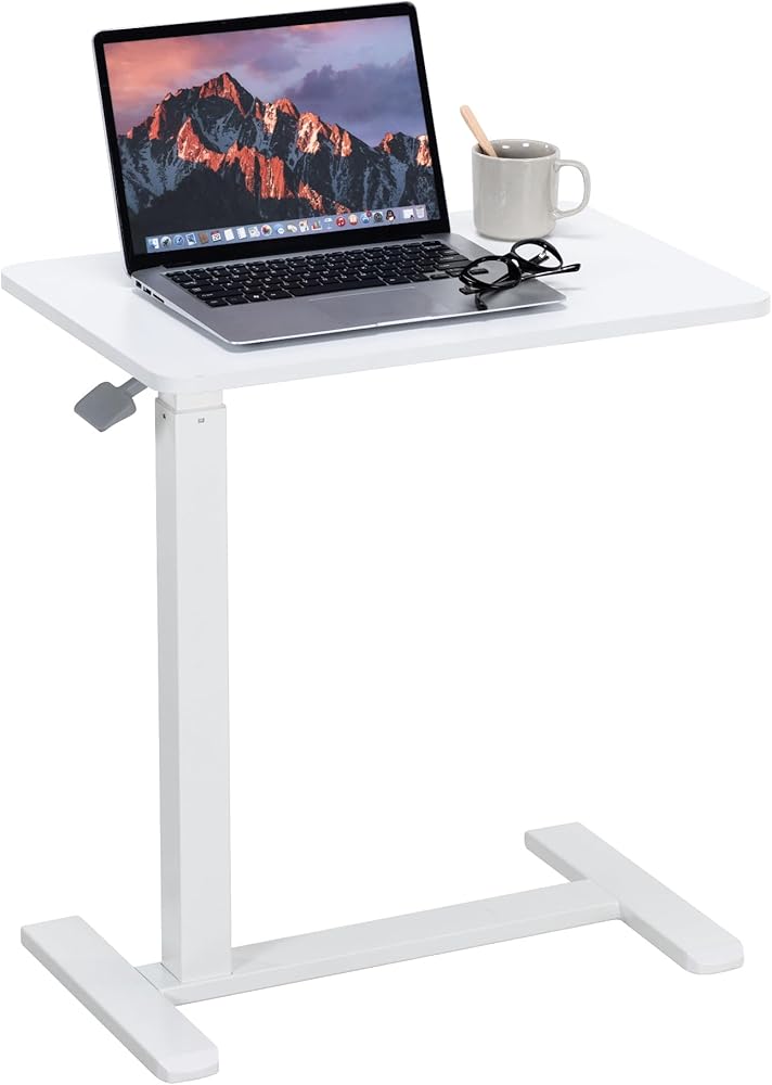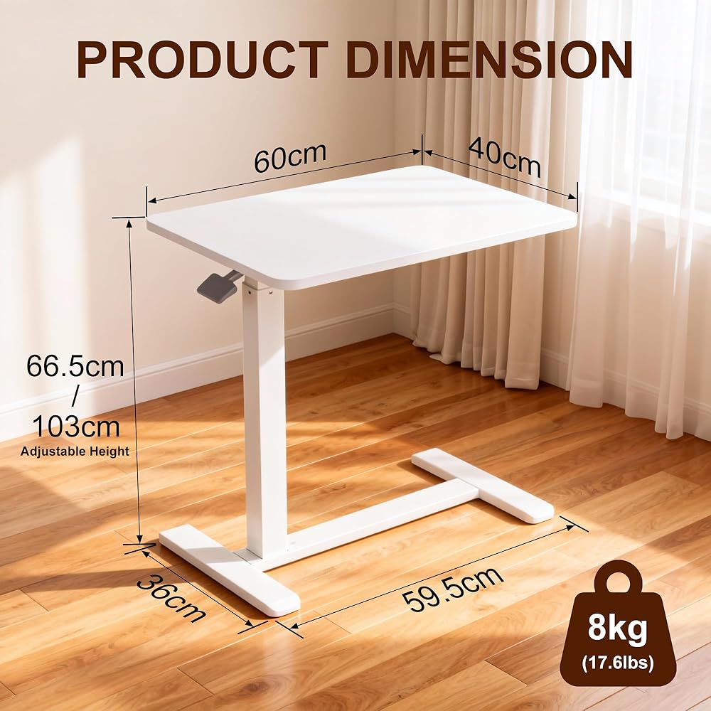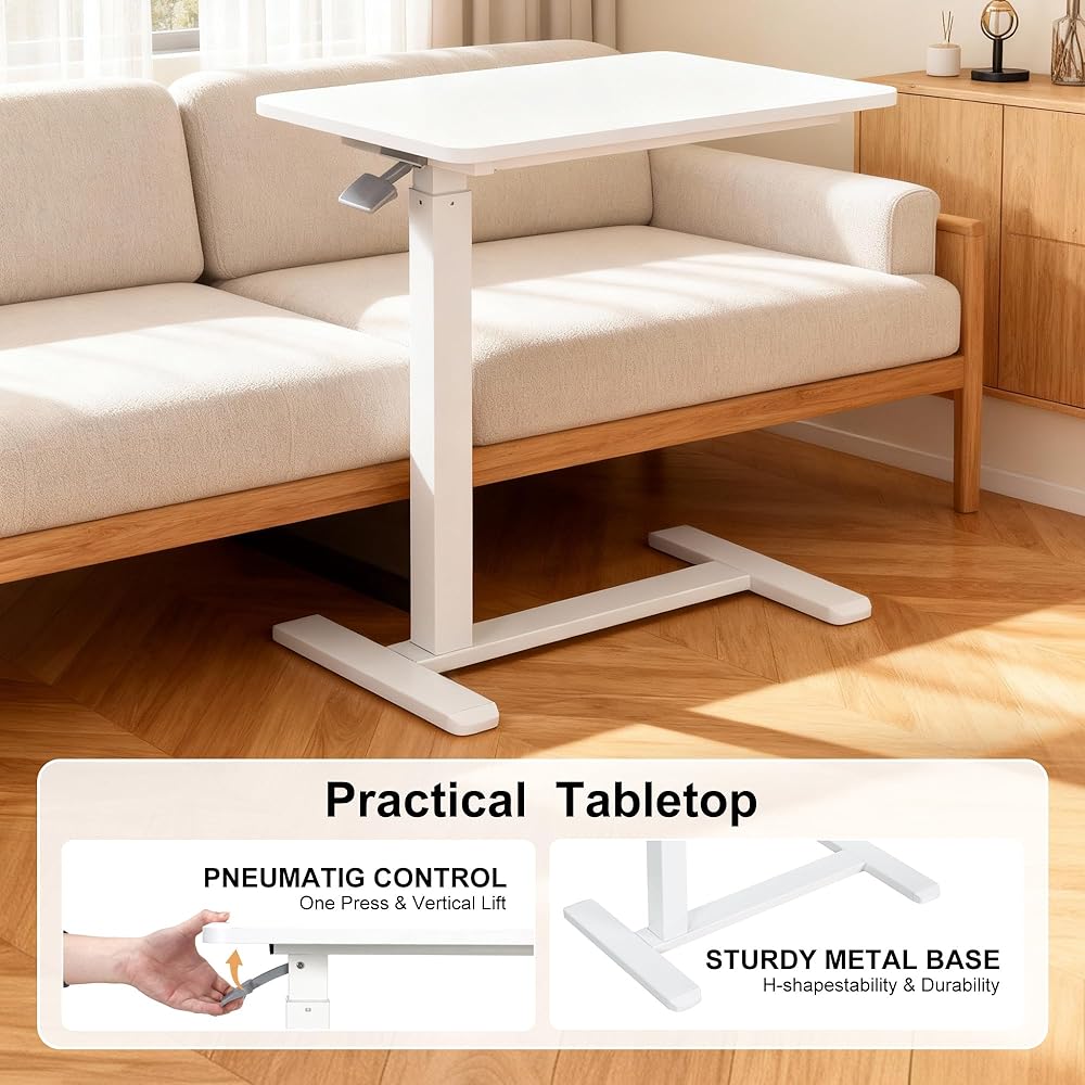 طاولة فوق السرير مع عجلات تعمل بالهواء المضغوط لسرير المستشفى وطاولة كمبيوتر محمول محمولة للاستخدام المنزلي وتعديل الارتفاع من 26.18 بوصة إلى 40.55 بوصة، باللون الأبيض