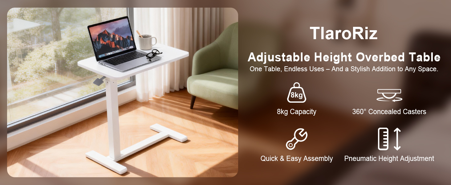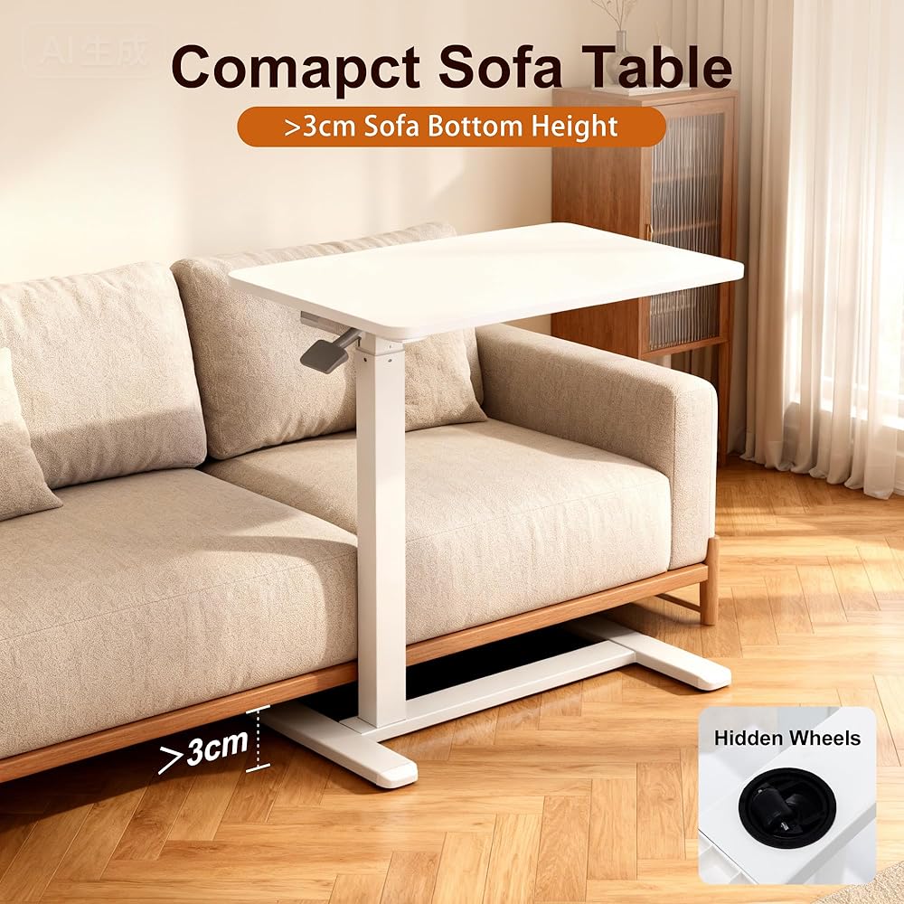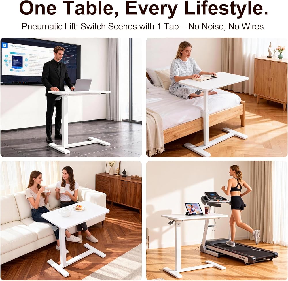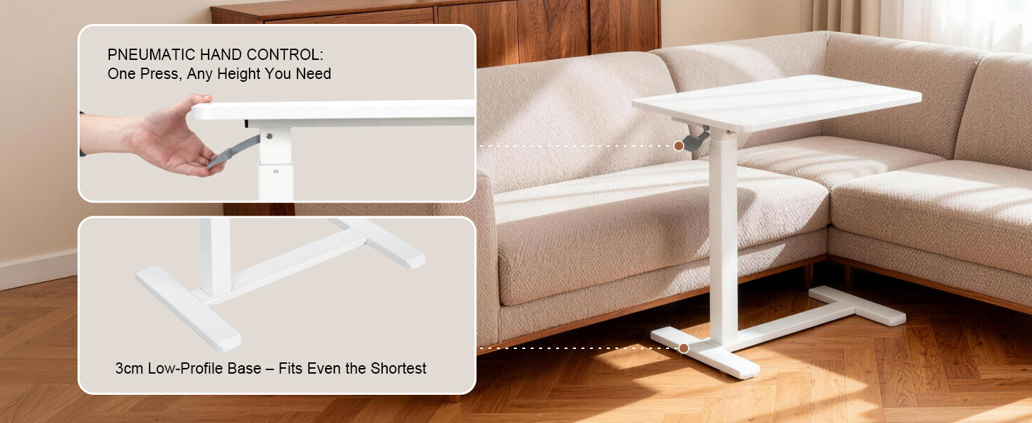 طاولة فوق السرير مع عجلات تعمل بالهواء المضغوط لسرير المستشفى وطاولة كمبيوتر محمول محمولة للاستخدام المنزلي وتعديل الارتفاع من 26.18 بوصة إلى 40.55 بوصة، باللون الأبيض