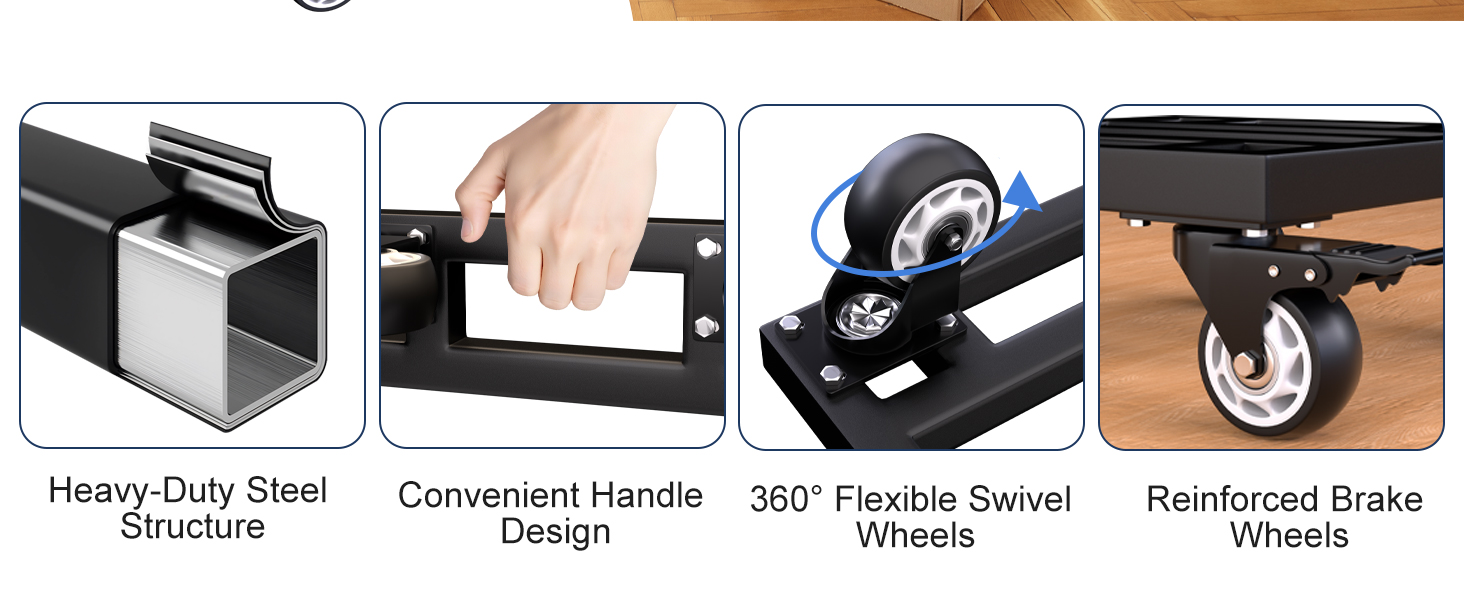 التجميع السريع: احصل على العمل في دقائق. تصل أداة الخدمة الشاقة الخاصة بك جاهزة للتجميع البسيط والخالي من الأدوات. ما عليك سوى تثبيت العجلات الأربع بأمان، وستكون جاهزًا لنقل أغراضك الثقيلة.