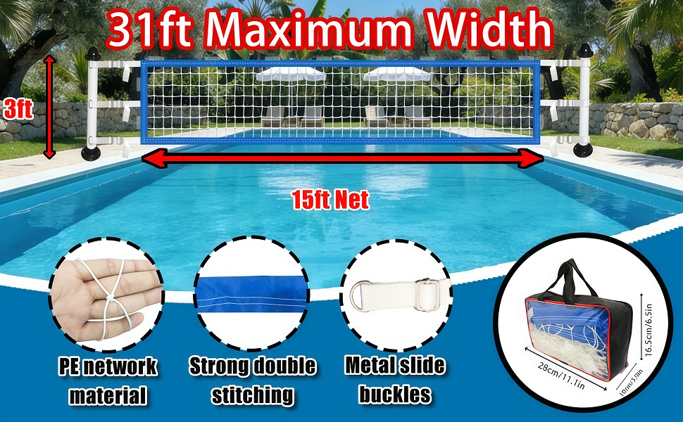 【طول قابل للتعديل】شبكة الكرة الطائرة هذه لحمام السباحة مصممة بنطاق ممتد قابل للتعديل من 15 قدمًا إلى 31 قدمًا، مما يضمن بإحكام مجموعة واسعة من أحجام حمام السباحة. الحجم المرن يجعلها خيارًا مثاليًا لكل من حمامات السباحة الداخلية وفوق الأرض.