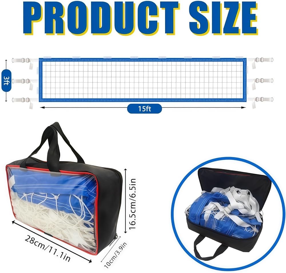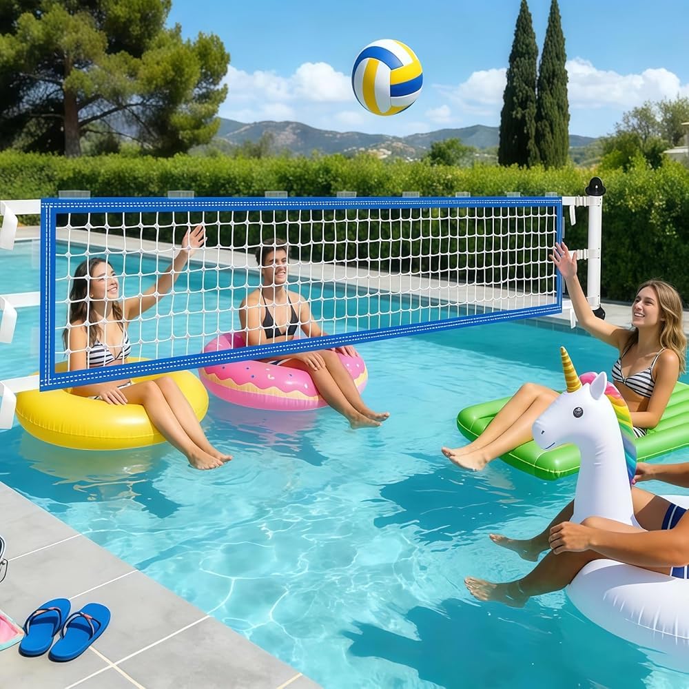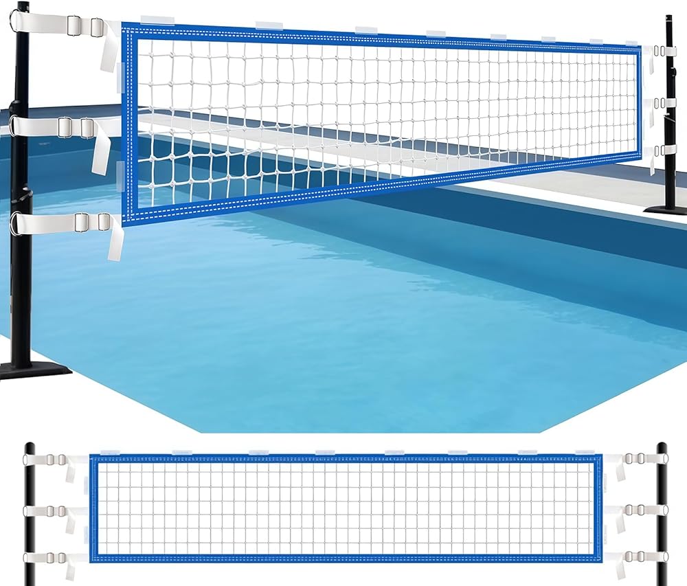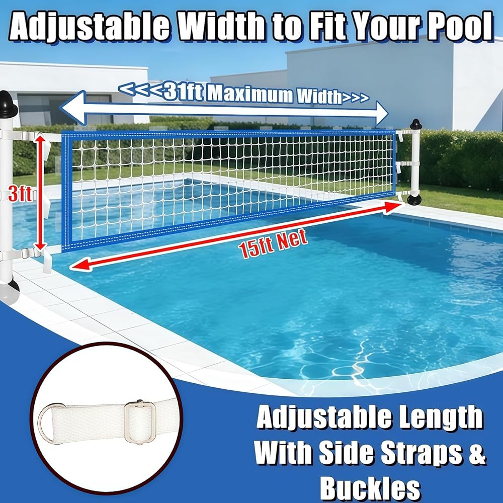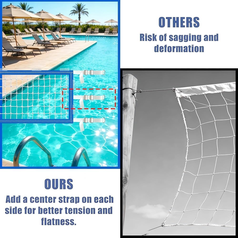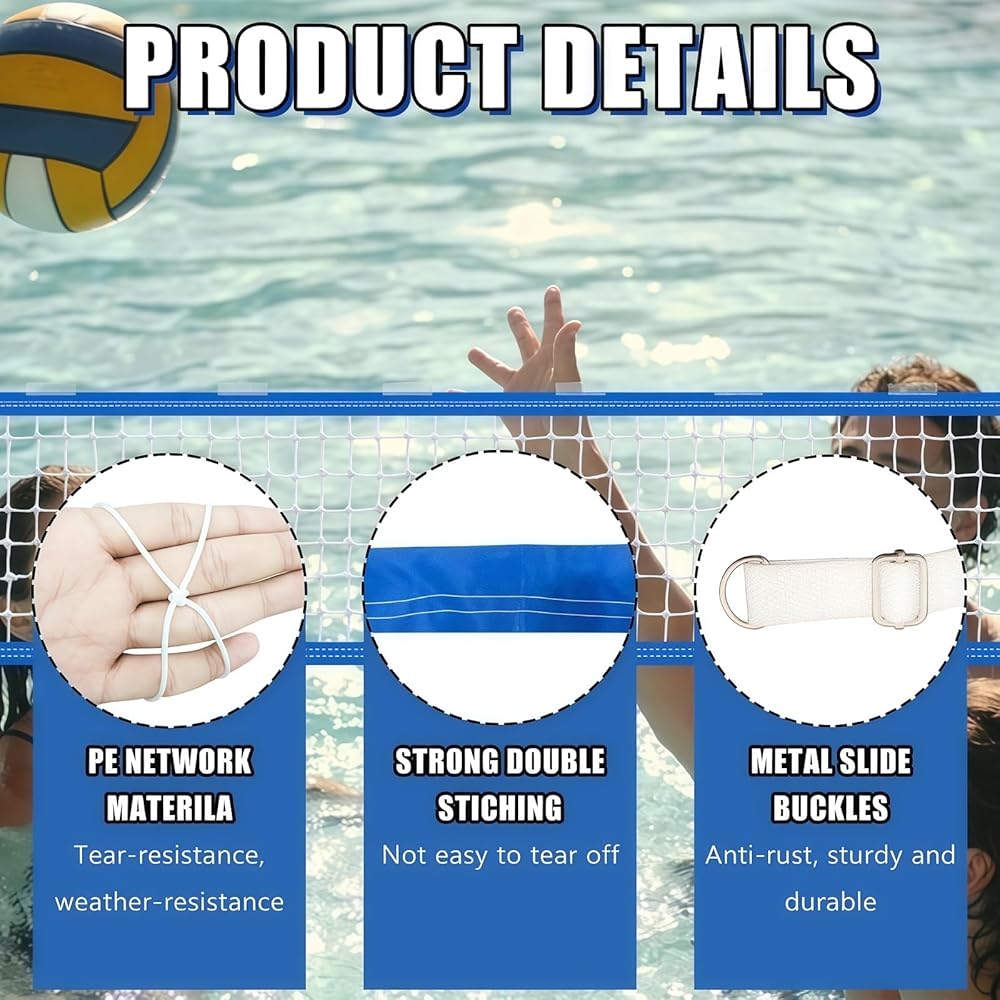 【خامة عالية الجودة】شبكة الكرة الطائرة لحمام السباحة مصنوعة من البولي إيثيلين عالي المقاومة، ولن تتمزق أو تتلف بسهولة. حواف أكسفورد المطورة مع طلاء من البولي يوريثان المقاوم للماء. حزام النايلون القابل للتعديل مع إبزيم معدني، قوي ومقاوم للتمزق ليتحمل ضربات الكرة الطائرة عالية التأثير في حمام السباحة.
