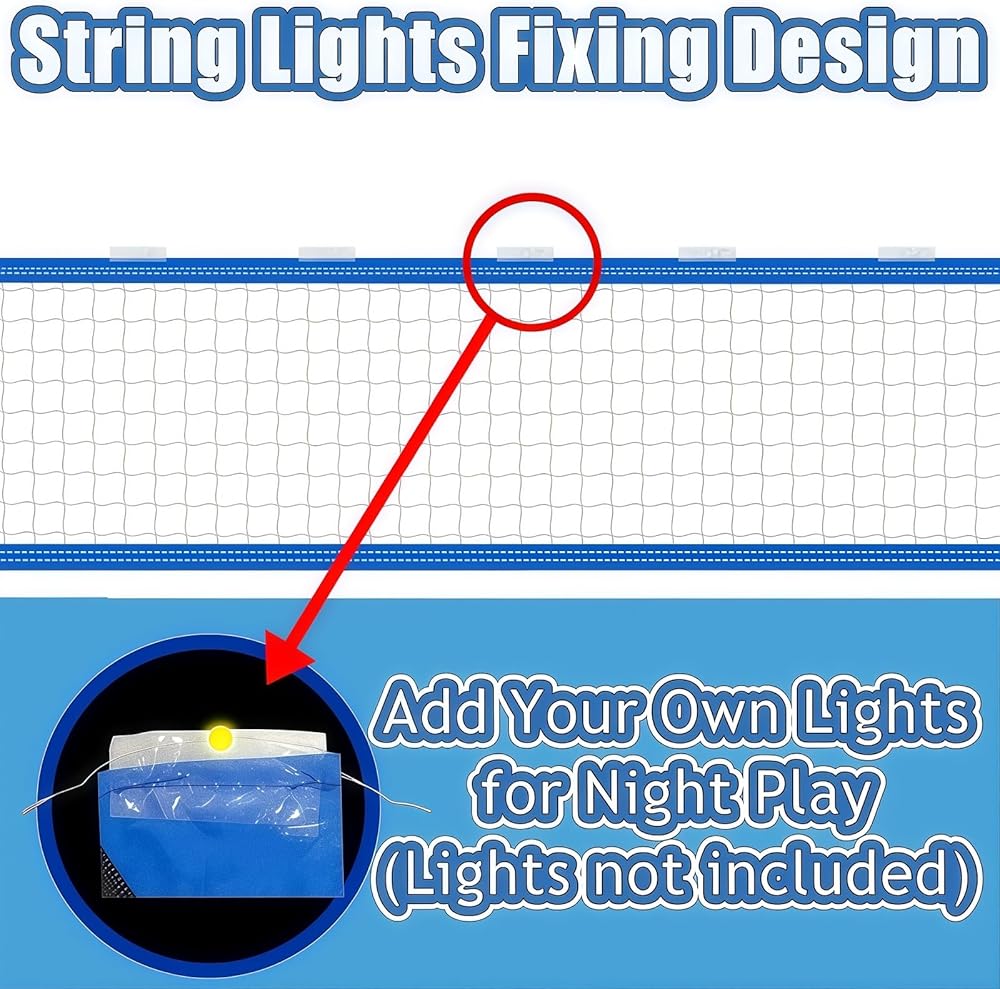 【تصميم مطور】تضيف شبكة الكرة الطائرة الشاطئية الخاصة بنا حزامًا مركزيًا على كل جانب لتحسين التوتر والتسطيح. تعتمد الشبكة أيضًا على تصميم تثبيت الضوء، يمكنك إضافة الأضواء الخاصة بك للعب الليلي. وتستخدم الشبكة أبازيم معدنية منزلقة، مضادة للصدأ، وقوية، ومتينة، وليس من السهل فراملها.