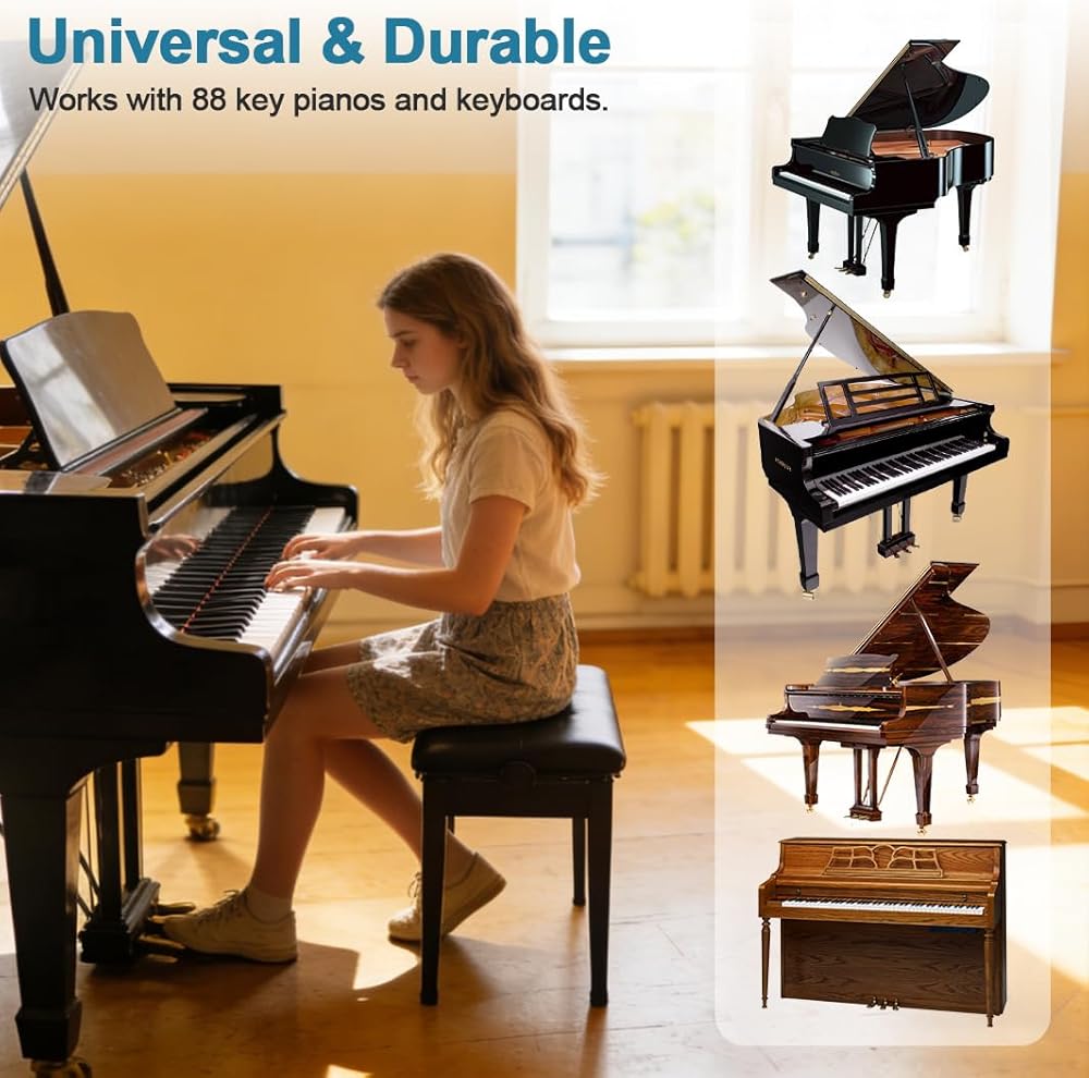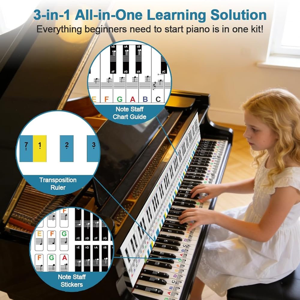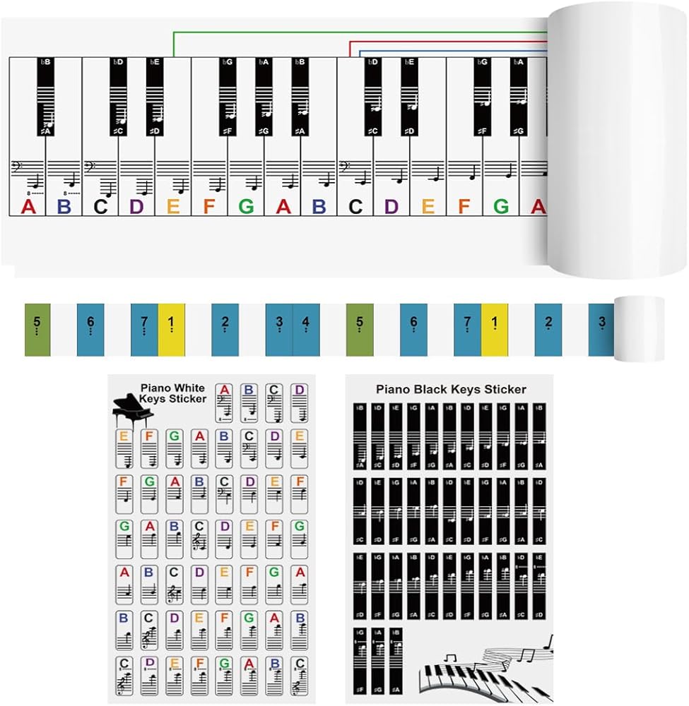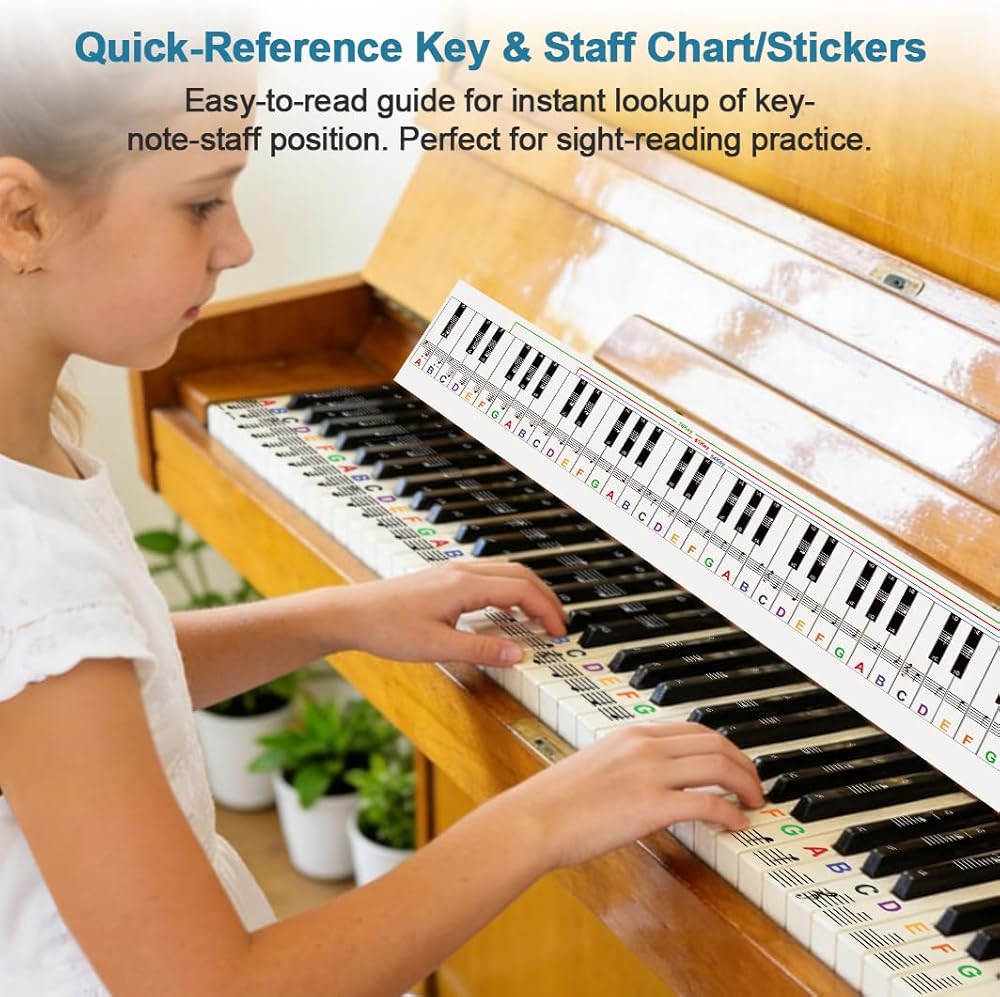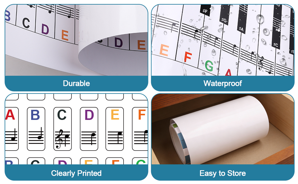 متينة وصديقة للبيئة وملاءمة عالمية: الملصقات القابلة للإزالة عالية الجودة لن تلحق الضرر بمفاتيح البيانو أو تترك علامات صمغ. الرسم البياني والمسطرة مصنوعان من مادة مقاومة للماء ومقاومة للتمزق. مناسبة للبيانو/لوحة المفاتيح ذات 88 مفتاحًا/76 مفتاحًا/61 مفتاحًا/54 مفتاحًا - مثالية للمبتدئين والأطفال والطلاب والمتعلمين البالغين.