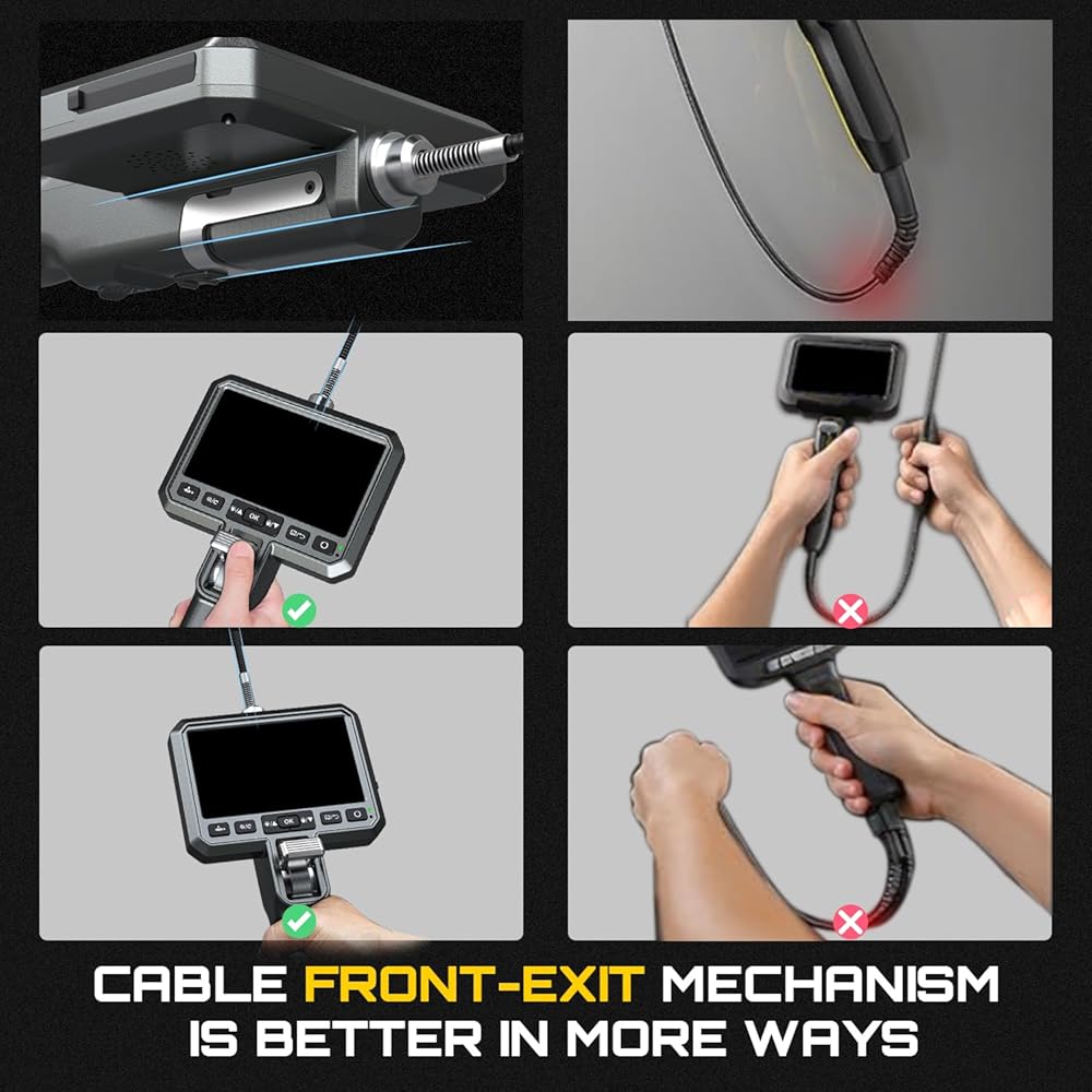 【تصميم مريح للمخرج الأمامي للكابل】يعد تصميم المخرج الأمامي للكابل تقنية قوية ويستخدم بشكل أساسي في آلاف المناظير المفصلية باهظة الثمن. والآن انتصرنا وحققنا!! وهو أكثر سلاسة وراحة في التشغيل من طراز الخروج الخلفي، خاصة فحص الاتجاه لأعلى والاتجاه الأمامي؛ تم تجهيز كاميرا الفحص AGC900D أيضًا بحامل يسمح لك بإمساك المقبض بحرية.