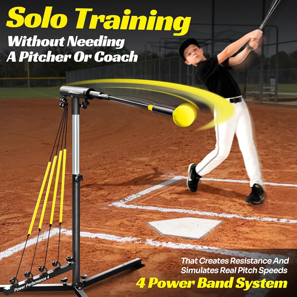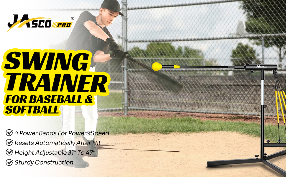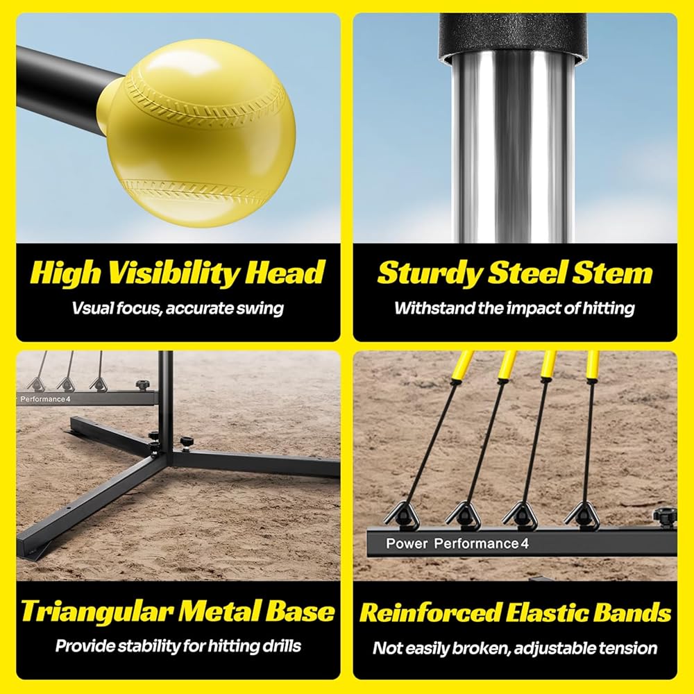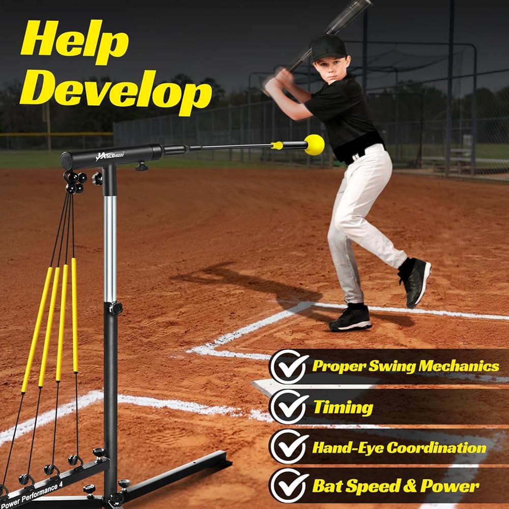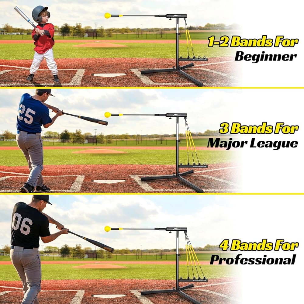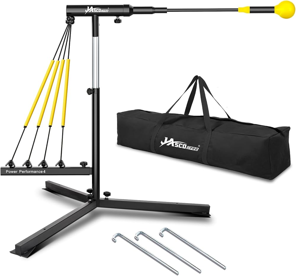 مدرب ضرب البيسبول مع 4 أحزمة طاقة، مدرب تأرجح الكرة اللينة لإعادة الضبط التلقائي للضرب، ممارسة الضرب، ارتفاع قابل للتعديل 31-47 بوصة معدات تدريب البيسبول مع أوتاد معدنية وحقيبة حمل
