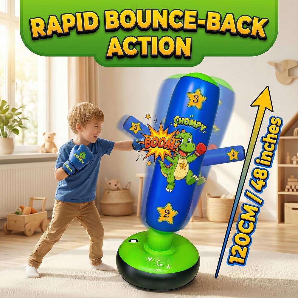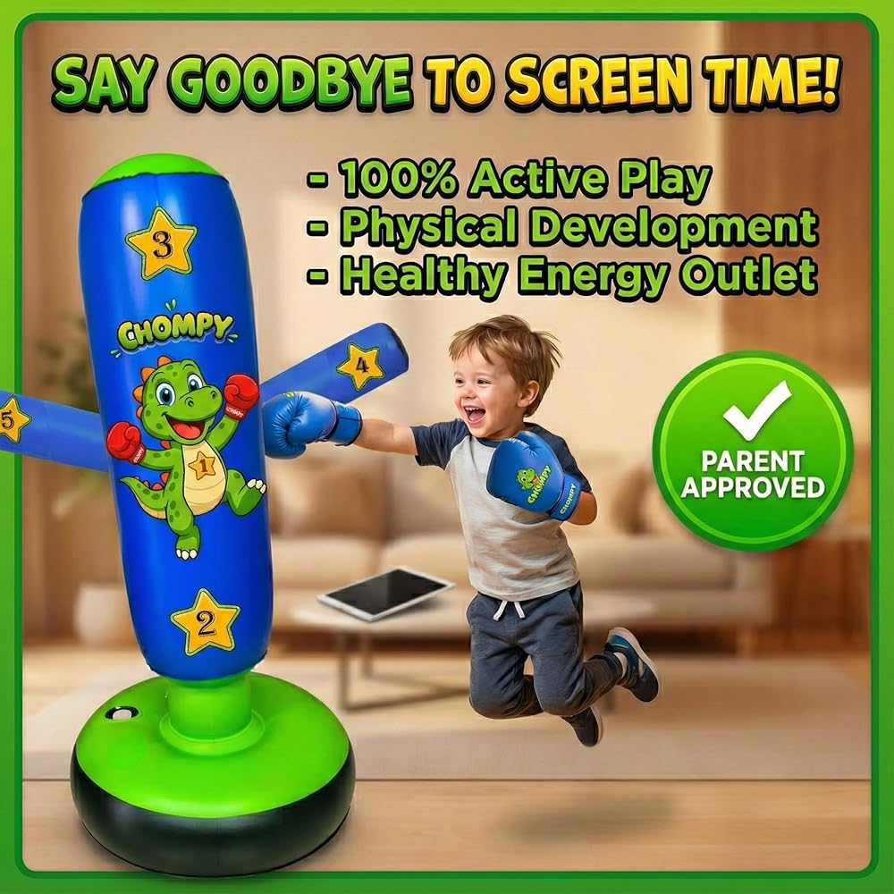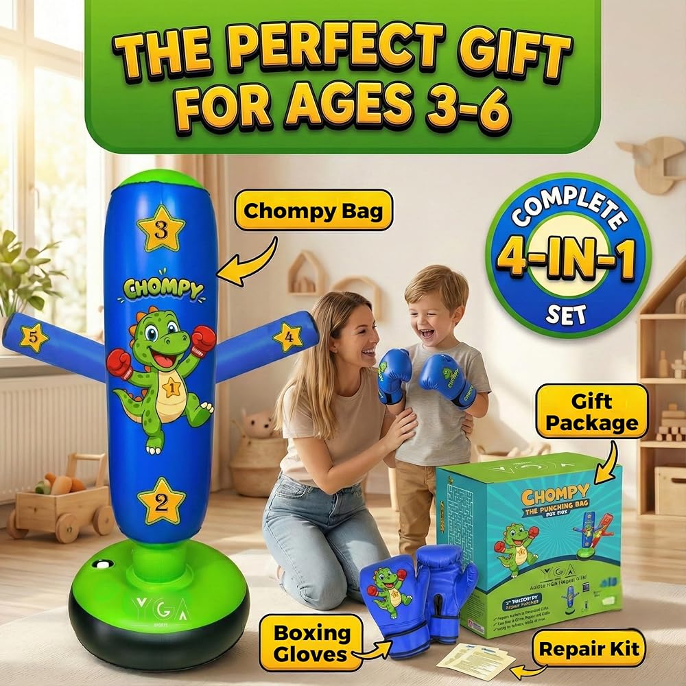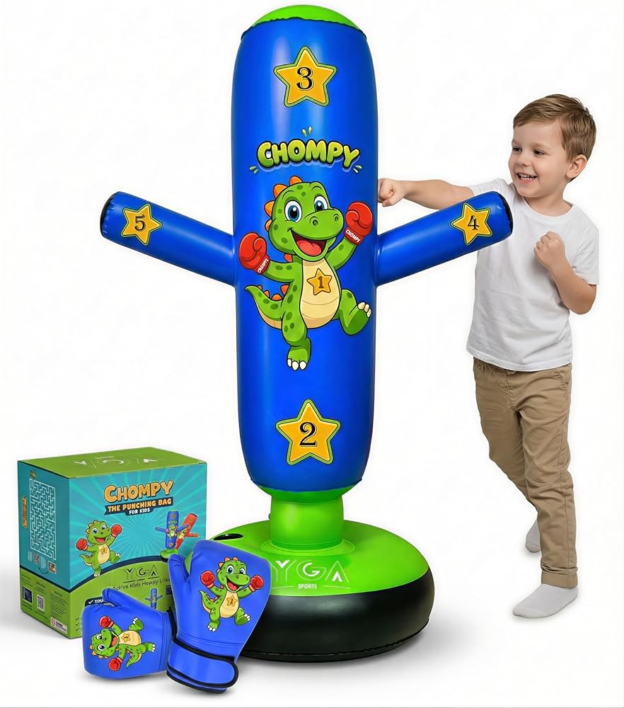The Perfect Match for Big & Little Siblings Tailored Heights for Every Age Finally, a boxing set that grows with your family. This bundle includes one 48 inch CHOMPY for younger children (ages 3-6) and one 63 inch PUNCHO Ninja for older kids (ages 6-12). No more compromising on size. Ninja vs. Dino Training Whether they want to spar with a Ninja or train with a Dinosaur, this set offers variety that keeps kids engaged. Both bags feature strategic targets to help improve accuracy, speed, and focus. Professional Grade Durability Both bags are engineered from ultra-durable 0.5mm PVC that stands up to the toughest kicks and punches. The extra-wide stable bases ensure the bags stay upright through vigorous training sessions. Physical Play Anywhere Designed for indoor use, these freestanding bags fit easily in bedrooms or playrooms. They are the ideal screen-free solution for active kids who need to release frustration and build confidence. Bonus Training Material Your purchase includes our exclusive digital eBook featuring martial arts drills and fun games, helping your kids get the most out of their new ninja and dino friends.
