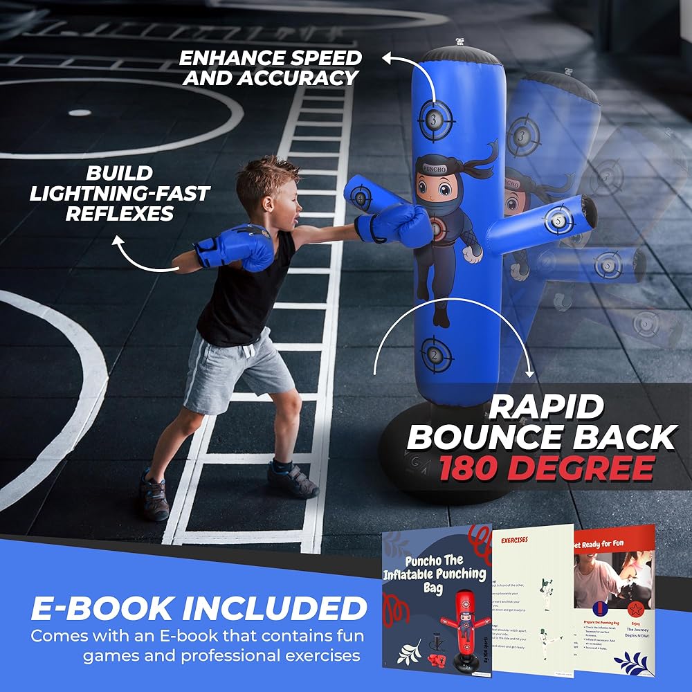 • 🤼 THE PERFECT AGE MIX: Finally, a boxing set that fits the whole family! Includes one 48" CHOMPY for the little ones (3-6) and one 63" PUNCHO Ninja for the bigger kids (6-12). Tailored heights for tailored training.