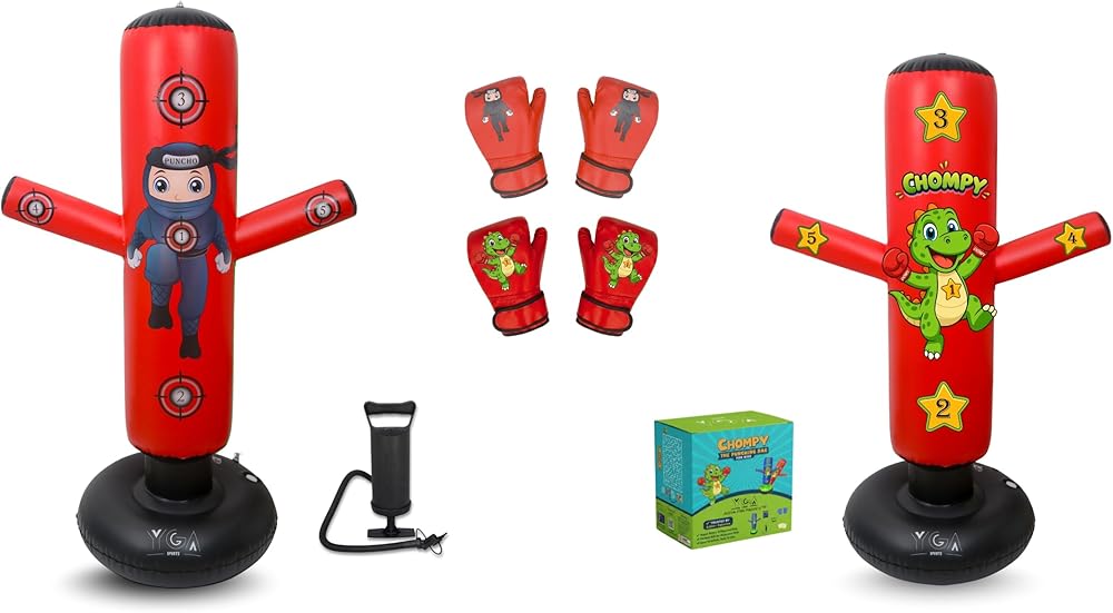 • 🤼 THE PERFECT AGE MIX: Finally, a boxing set that fits the whole family! Includes one 48" CHOMPY for the little ones (3-6) and one 63" PUNCHO Ninja for the bigger kids (6-12). Tailored heights for tailored training.