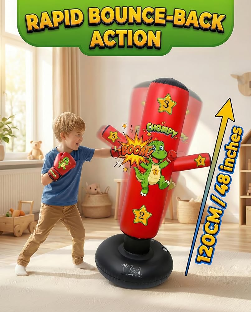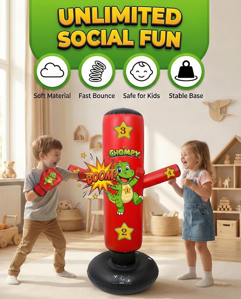The Perfect Match for Big & Little Siblings Tailored Heights for Every Age Finally, a boxing set that grows with your family. This bundle includes one 48 inch CHOMPY for younger children (ages 3-6) and one 63 inch PUNCHO Ninja for older kids (ages 6-12). No more compromising on size. Ninja vs. Dino Training Whether they want to spar with a Ninja or train with a Dinosaur, this set offers variety that keeps kids engaged. Both bags feature strategic targets to help improve accuracy, speed, and focus. Professional Grade Durability Both bags are engineered from ultra-durable 0.5mm PVC that stands up to the toughest kicks and punches. The extra-wide stable bases ensure the bags stay upright through vigorous training sessions. Physical Play Anywhere Designed for indoor use, these freestanding bags fit easily in bedrooms or playrooms. They are the ideal screen-free solution for active kids who need to release frustration and build confidence. Bonus Training Material Your purchase includes our exclusive digital eBook featuring martial arts drills and fun games, helping your kids get the most out of their new ninja and dino friends.