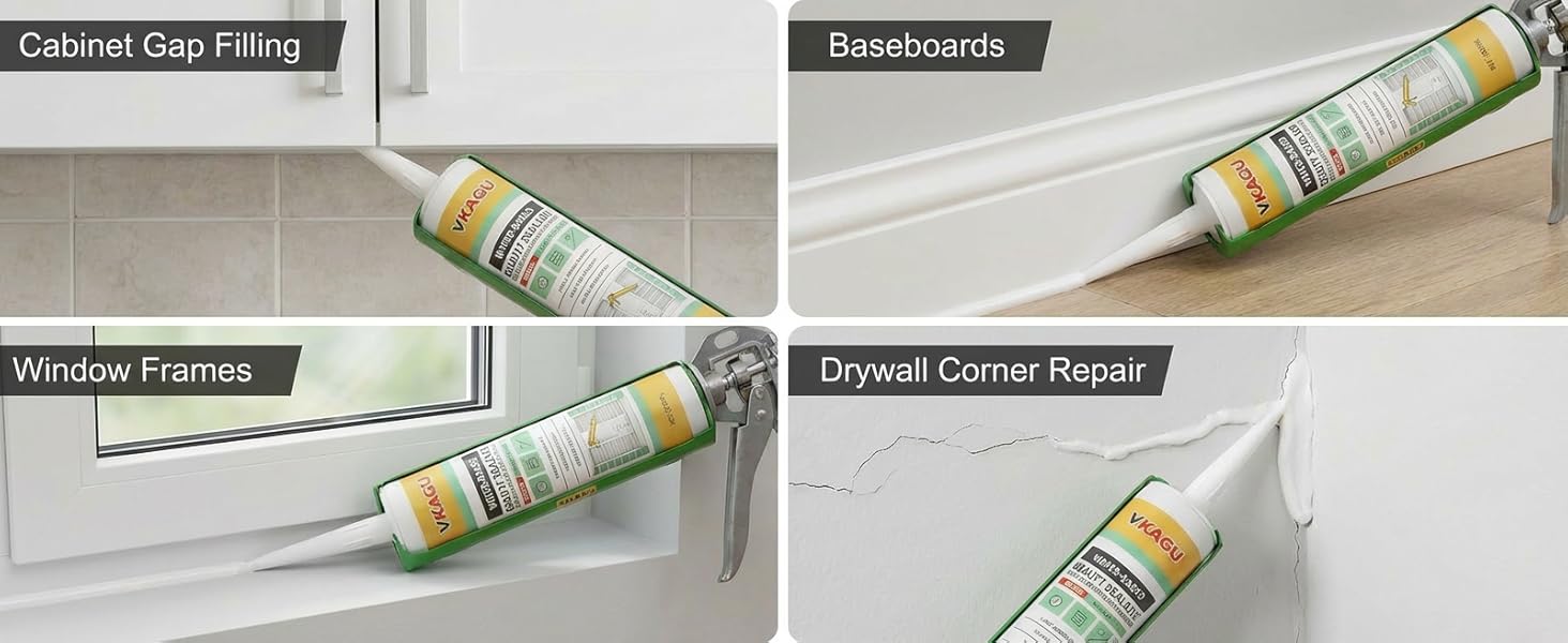 • التصاق متعدد الأسطح: يوفر التصاقًا قويًا بمواد البناء الشائعة بما في ذلك الخشب والجدران الجافة والجص والطوب والبناء. استخدمه لملء الفجوات القبيحة في إطارات الأبواب، والألواح الخشبية، والخزائن، ومفاصل الزوايا قبل الطلاء. (ملاحظة: مصمم للمناطق الجافة الداخلية، وليس للغمر المستمر في الماء).