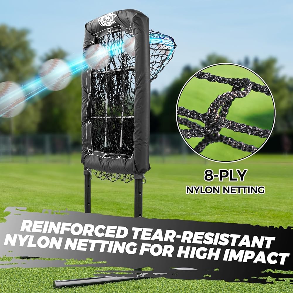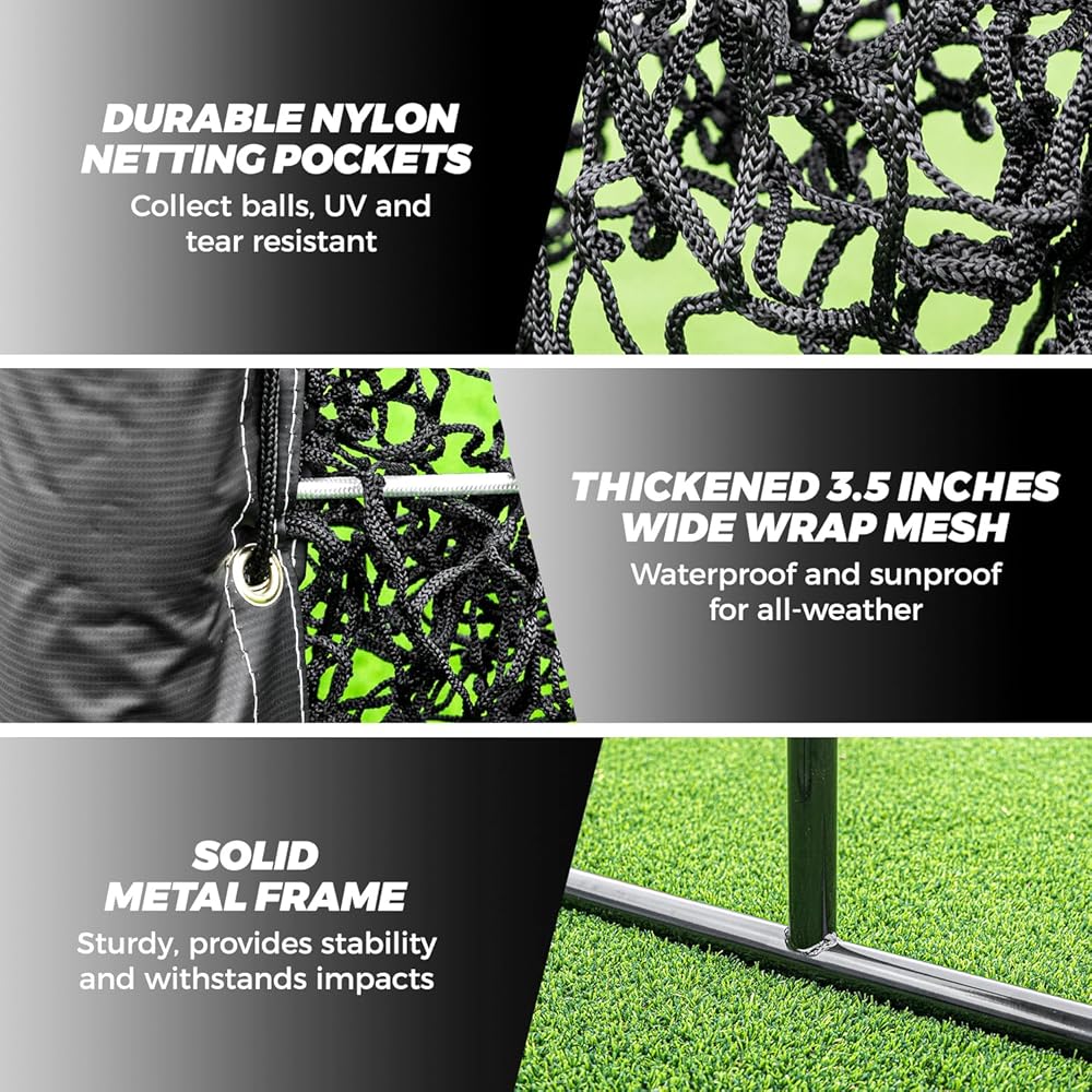 ⚾【إطار معدني قوي】 شبكة البيسبول مصنوعة من قدمين على شكل حرف T للخدمة الشاقة، وشبكة من النايلون 8 طبقات وأعمدة معدنية مطلية بمسحوق بعرض 1.3 بوصة. يمكنها تحمل تأثير الملعب وتستخدم في جميع الأحوال الجوية لمنع الصدأ أو الكسر. تأتي مع 4 أوتاد أرضية و2 كيس رمل لتوفير ثبات إضافي لضمان عدم انقلاب شبكة الرمي.