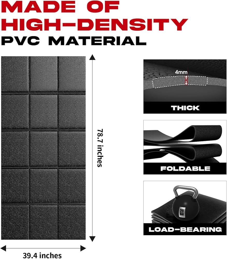 𝐏𝐕𝐂 𝐌𝐀𝐓𝐄𝐑𝐈𝐀𝐋: مصنوع من مادة PVC عالية الكثافة مع متانة لا مثيل لها وتوسيد لتحمل معدات اللياقة البدنية الثقيلة، ويحمي الأرضيات والسجاد بالكامل