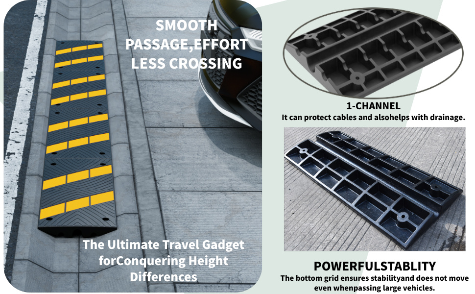 • منحدر مطاطي متين: مصنوع من مطاط عالي الجودة ومقاوم للطقس، هذا المنحدر المطاطي يتحمل التآكل والأشعة فوق البنفسجية والظروف القاسية. سطح غير قابل للانزلاق يعزز سلامة المركبات والمشاة.