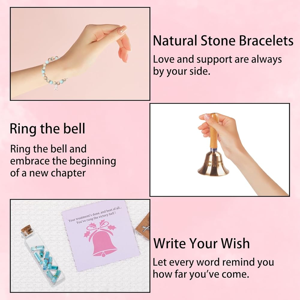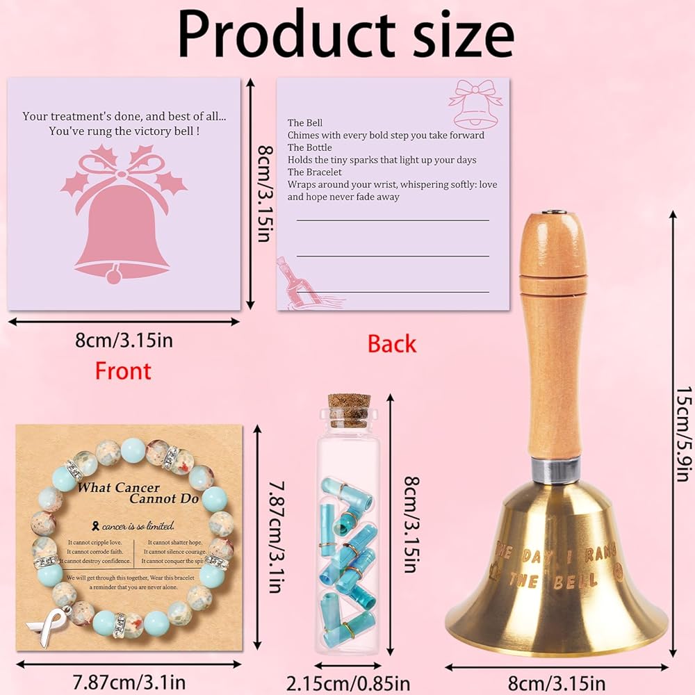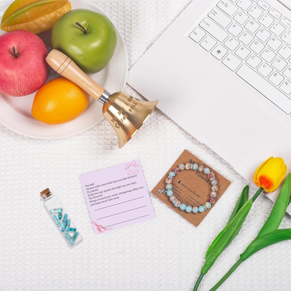 COMPLETE CANCER GIFT SET: Includes 1 engraved handbell (“The Day I Rang The Bell”), 1 inspirational cancer bracelet, and 1 wish bottle. Thoughtfully packaged as a ready-to-give chemo graduation or remission gift box.