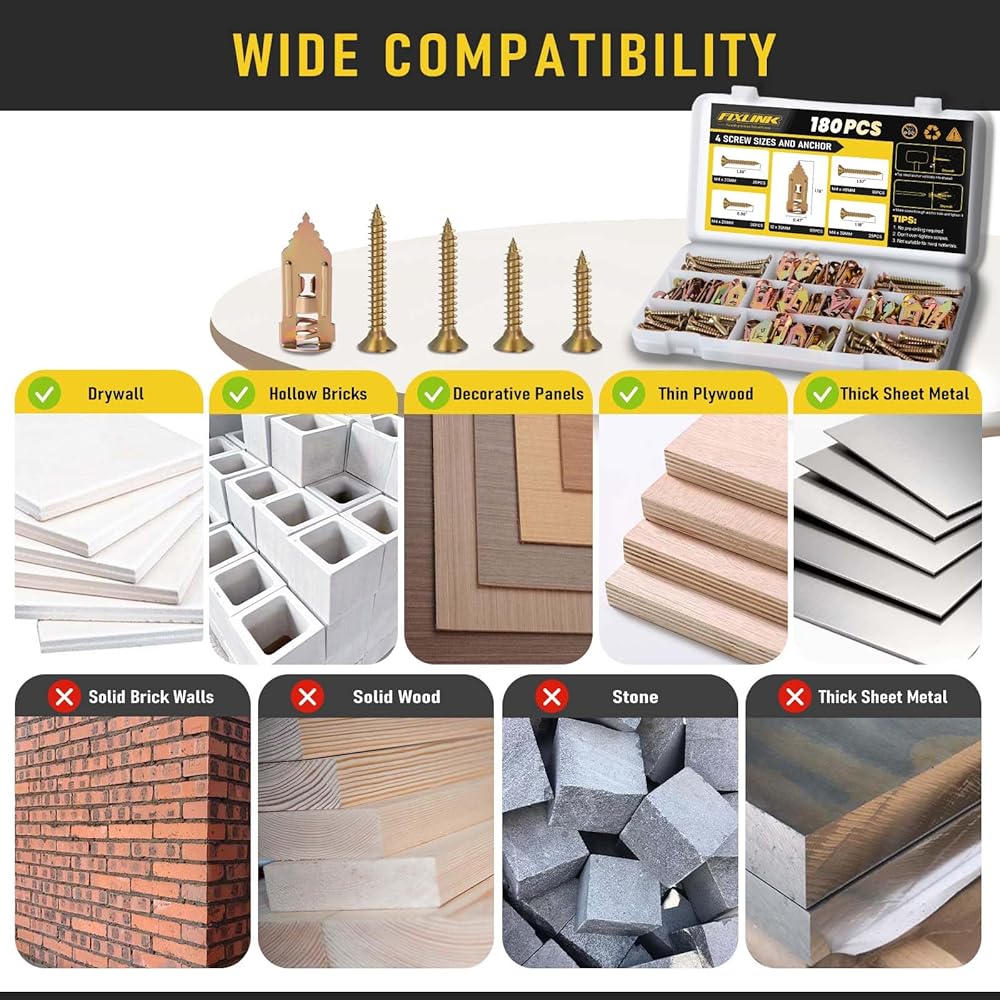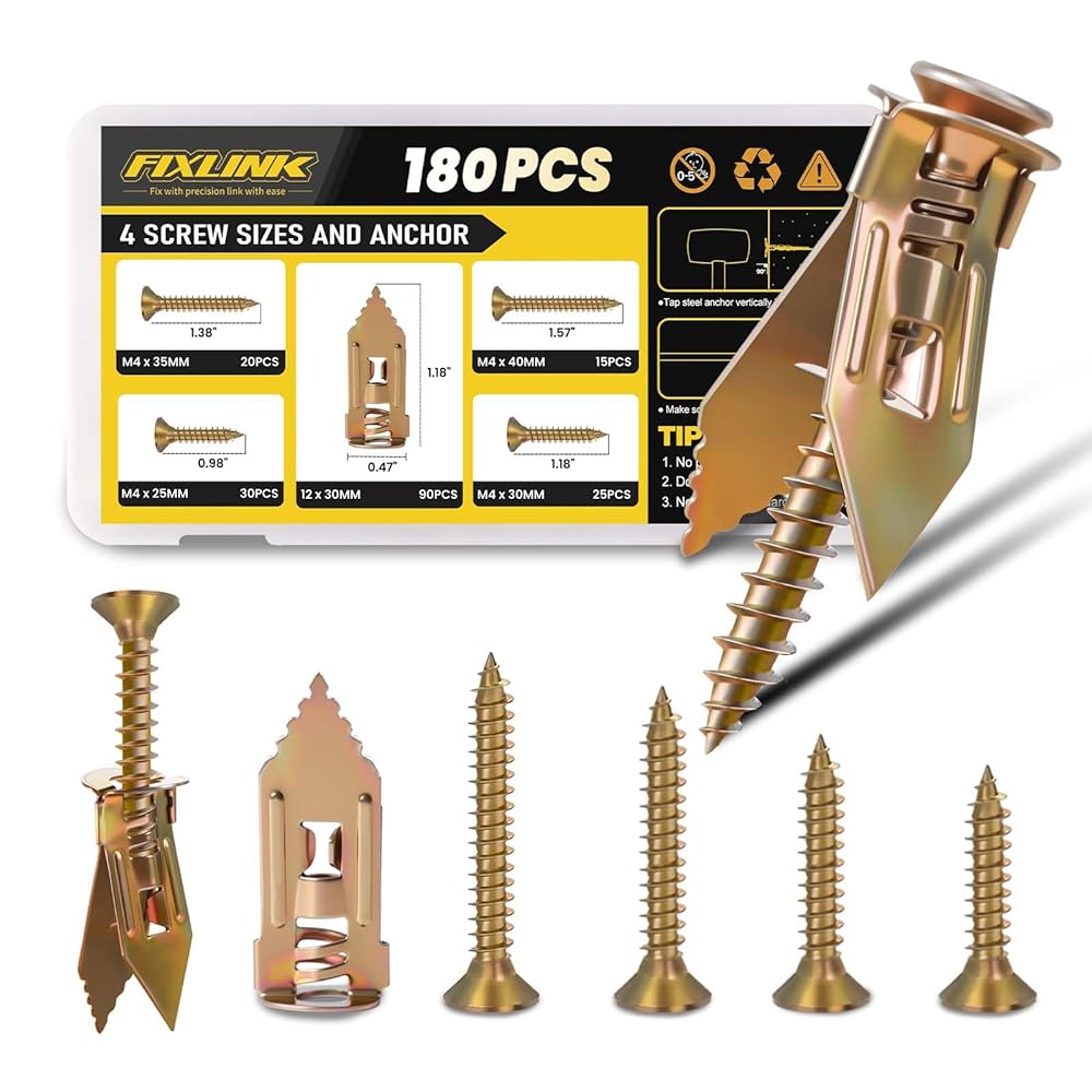 مجموعة أدوات تثبيت الحوائط الجافة ذاتية الحفر، FIXLINK 180 قطعة بمقاس واحد من مرساة الألواح الصخرية و4 براغي بأحجام، فولاذ مطلي بالزنك، بدون حفر أو ثقوب في الحائط، للتلفزيون، التعليق على الحائط، الخزانات