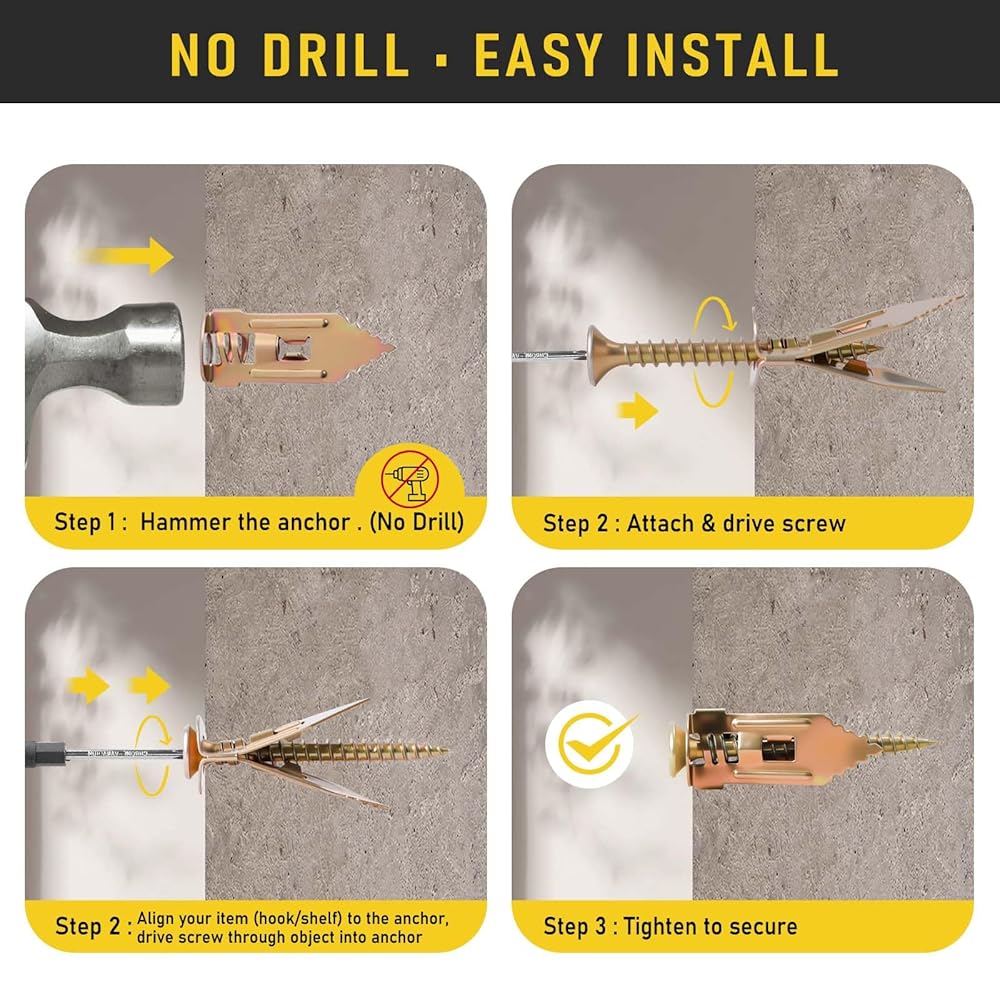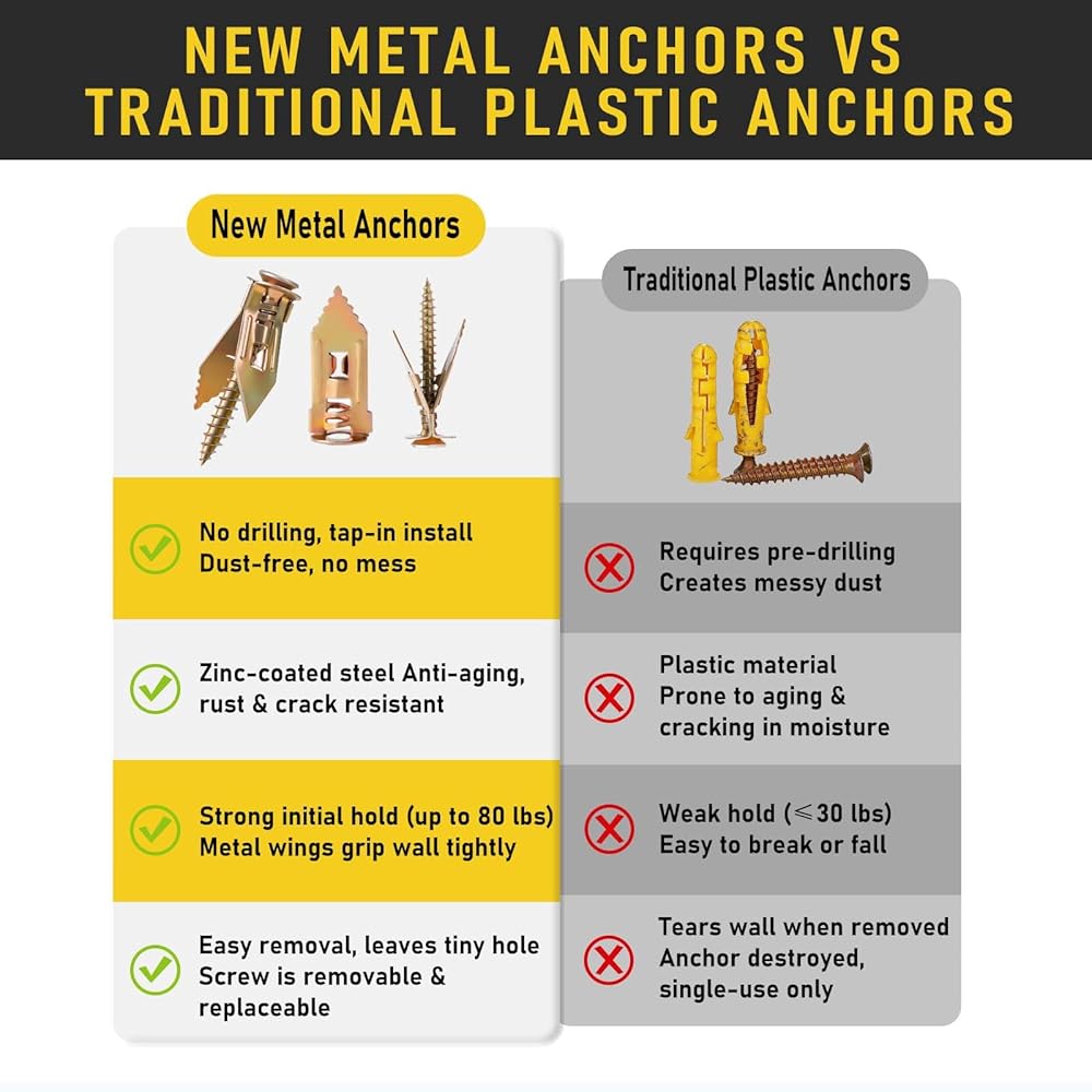 No-Pre-Drill Easy Installation: The conical tip of the heavy duty metal wall anchors facilitates easy installation with minimal damage to the wall surface. No pilot holes, Hammer anchors flush, insert fasteners, tightenEach drywall anchor expands tightly inside the wall for strong load holding. This is more convenient and quicker than traditional plastic anchors.