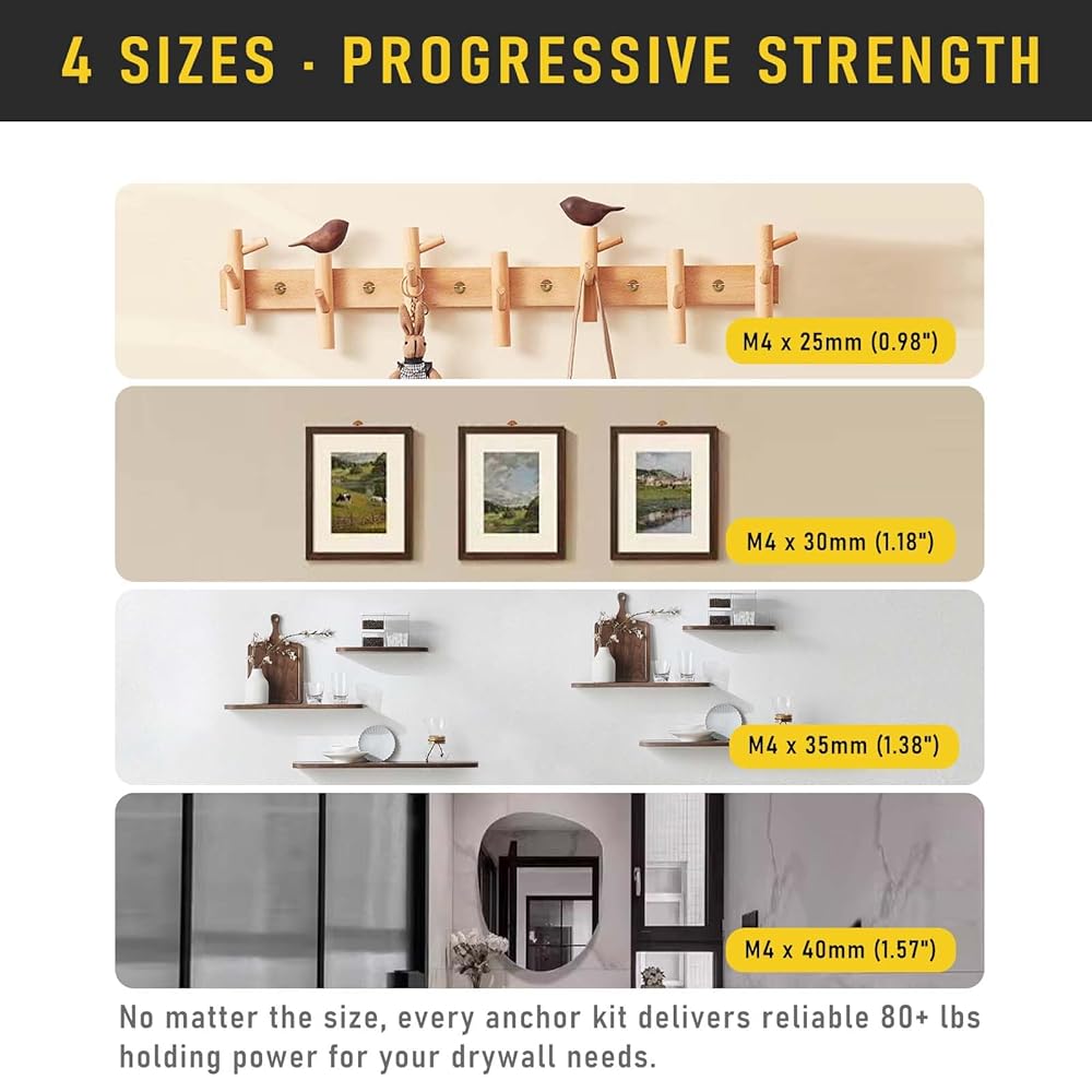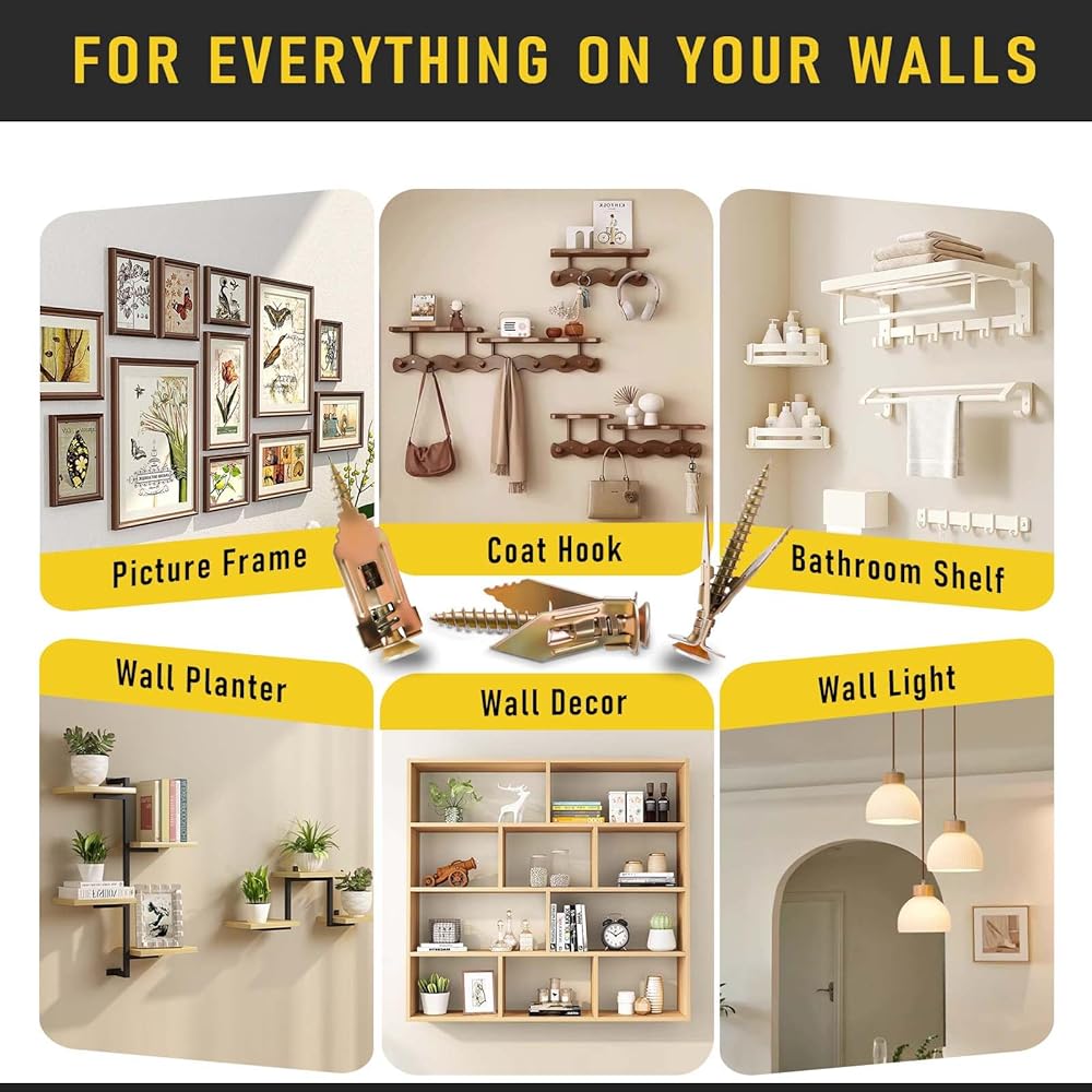 WIDE APPLICATION: These Drywall anchors are Works perfectly in drywall, gypsum, hollow & lightweight bricks. Fits most drywall types, and suit for picture frames, wall décor, small shelves, indoor planters, hanging planters, and picture hanging kit, and everyday mounting tasks. Perfectly fits for daily use in homes, offices, and apartments, No more buying separate kits.