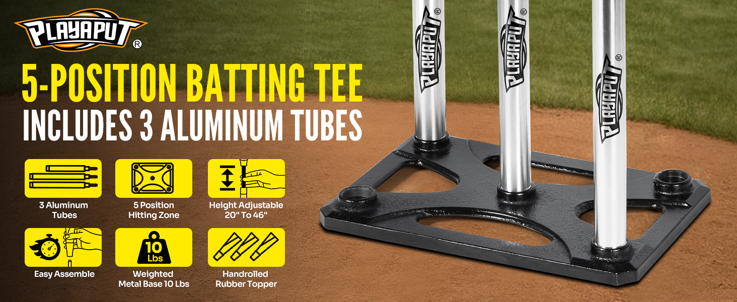 تي شيرت بخمسة مواضع، ارتفاع قابل للتعديل 20-46 بوصة، تي شيرت لضرب البيسبول والكرة اللينة مع سطح مطاطي ملفوف يدويًا، ألومنيوم 3 أنابيب، قاعدة معدنية للبيسبول والتمارين الخارجية