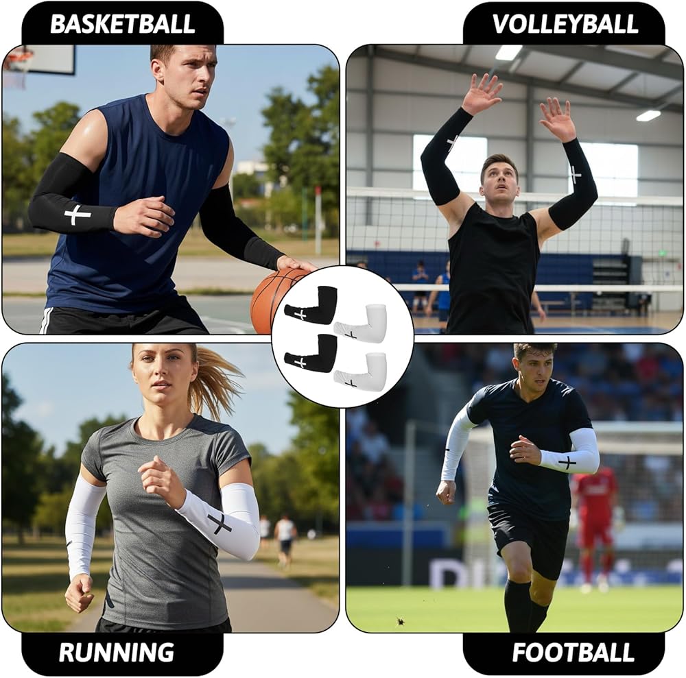 【Product Includes】You will receive two pairs of arm sleeves, one white and one black. The top width is 12.5 cm, the bottom width is 8.5 cm, and the length is approximately 40 cm. Basketball arm sleeve is easily adjustable to fit different arm sizes, providing gentle pressure and a comfortable wearing experience