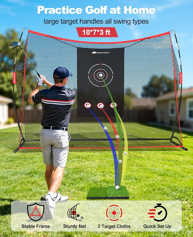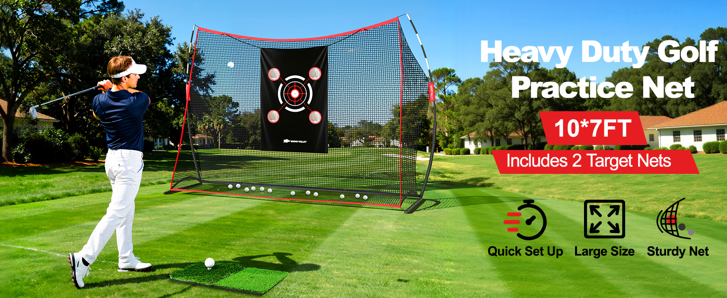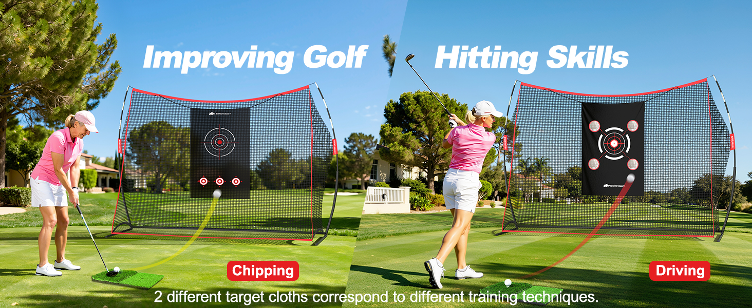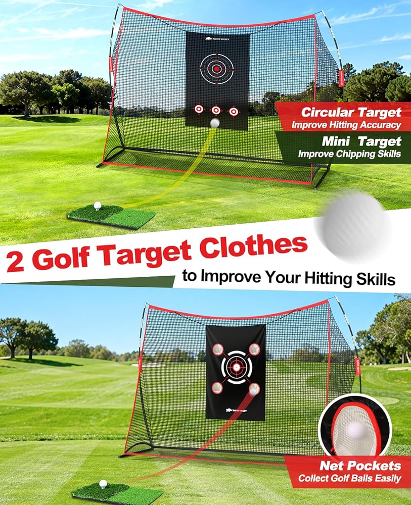• تصميم هدفين - تتميز شبكة تدريب الجولف بطول 10 × 7 أقدام مع بساط التدريب بهدفين من الدرجة الاحترافية، تلبي جميع مستويات المهارة في التأرجح والقيادة وممارسة التقطيع، لمساعدة المبتدئين والمتحمسين واللاعبين المتمرسين على رفع مستوى لعبتهم، وفتح إمكاناتك الكاملة في الدورة.