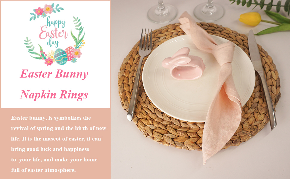 زينة رائعة لطاولة عيد الفصح: يرمز أرنب عيد الفصح إلى إحياء الربيع وولادة حياة جديدة. إنها تميمة عيد الفصح، يمكنها جلب الحظ السعيد والسعادة إلى الحياة. مع حلقات مناديل أرنب عيد الفصح الرائعة هذه، سيكون إعداد طاولة عيد الفصح الخاص بك أكثر دقة وأناقة. سوف تحصل على الكثير من الثناء من ضيوفك