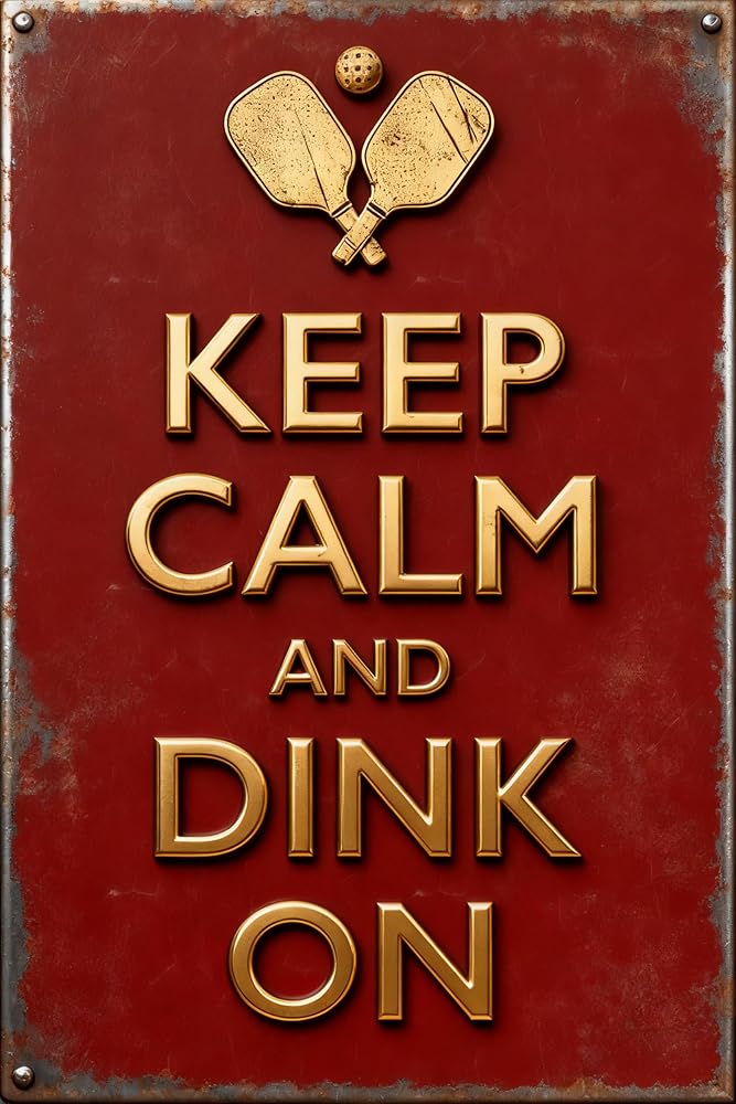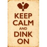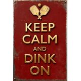 Bring your love for pickleball into your home with this charming Keep Calm and Dink On metal wall decor sign. Perfect for pickleball enthusiasts, this decorative signage celebrates the sport's most finesse-filled shot—the dink—with a playful twist on the classic motivational poster design. The vintage-inspired aesthetic features a distressed beige background with bold brown lettering and iconic crossed paddles with a pickleball above, creating an eye-catching focal point for any room. Whether you're decorating your game room, home court area, garage, or living space, this metal sign adds personality and showcases your passion for America's fastest-growing sport. It makes an excellent gift for pickleball players, coaches, or anyone who can't get enough court time. Display it proudly to remind yourself and others to stay calm, keep dinking, and enjoy every rally.