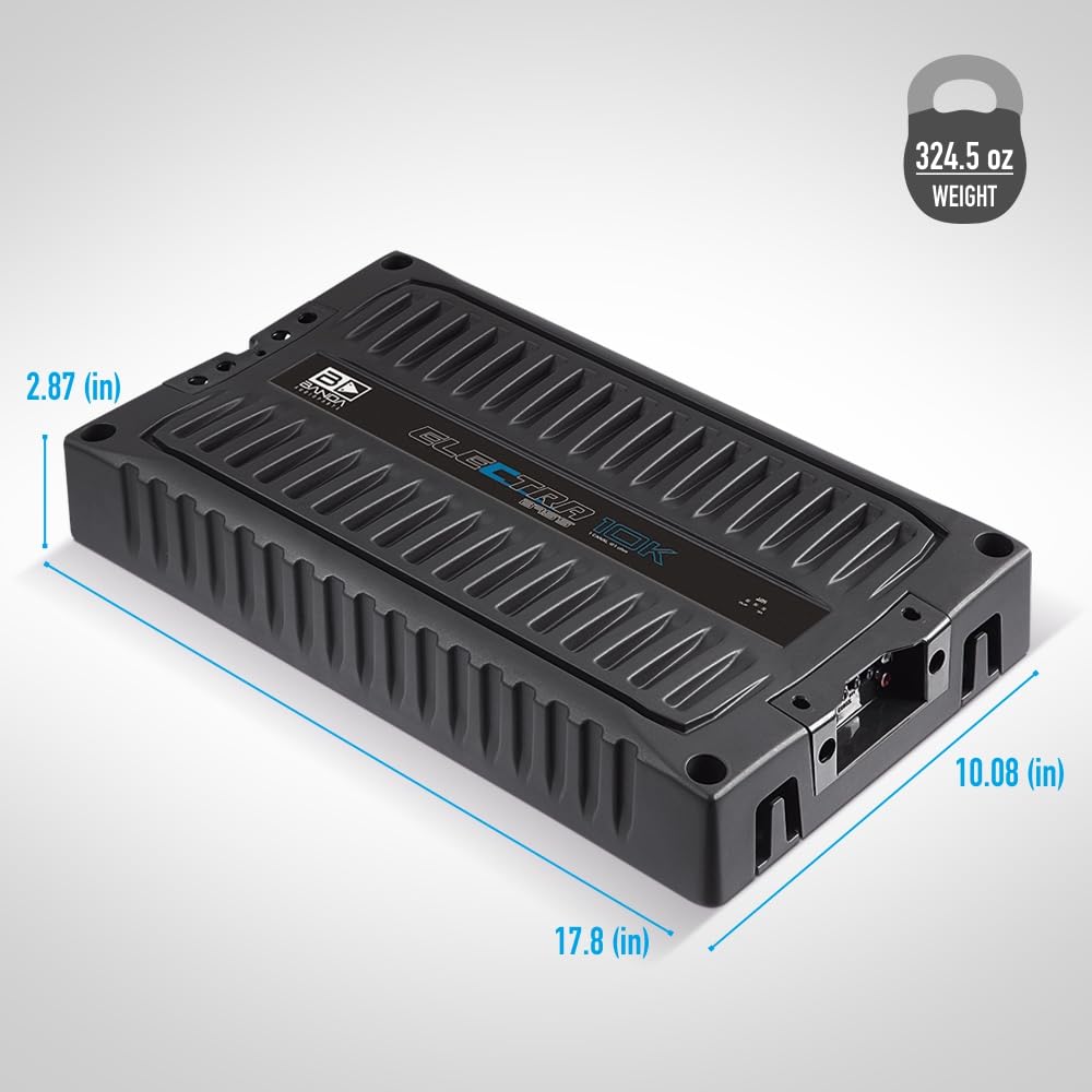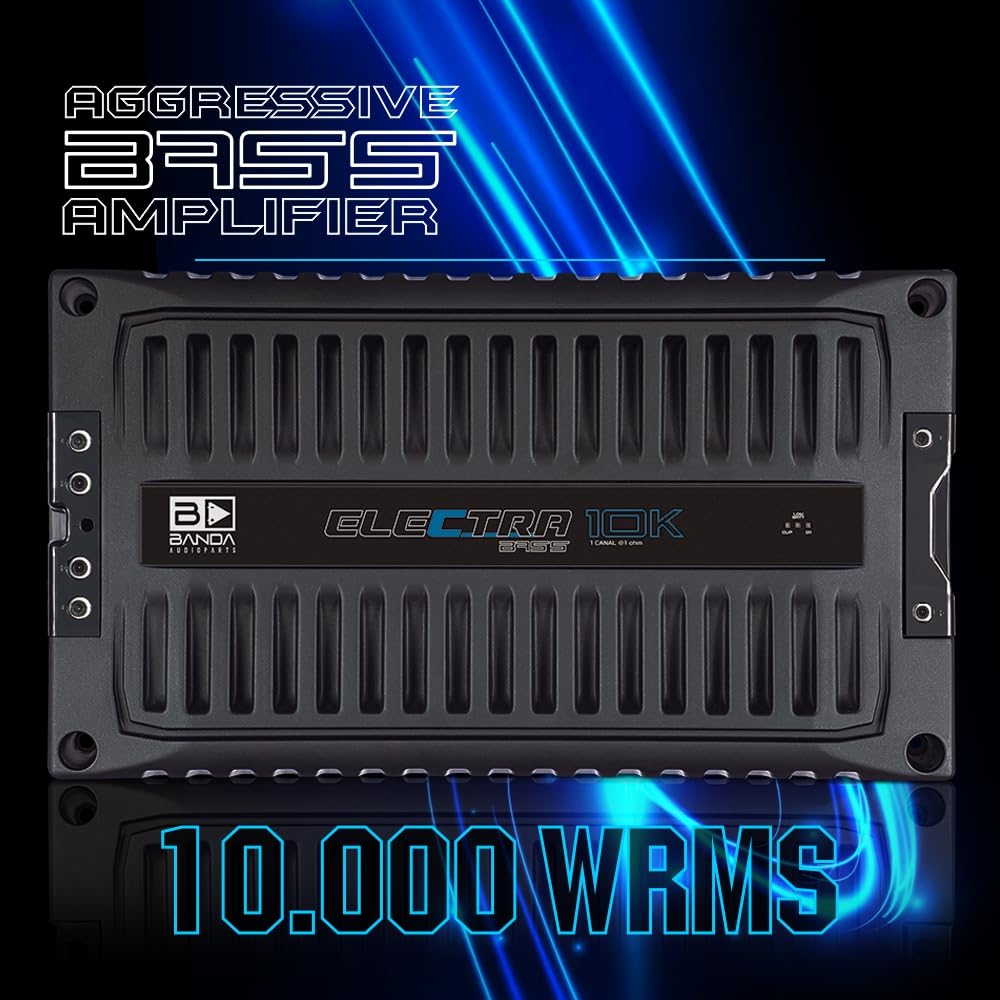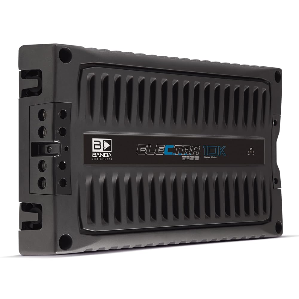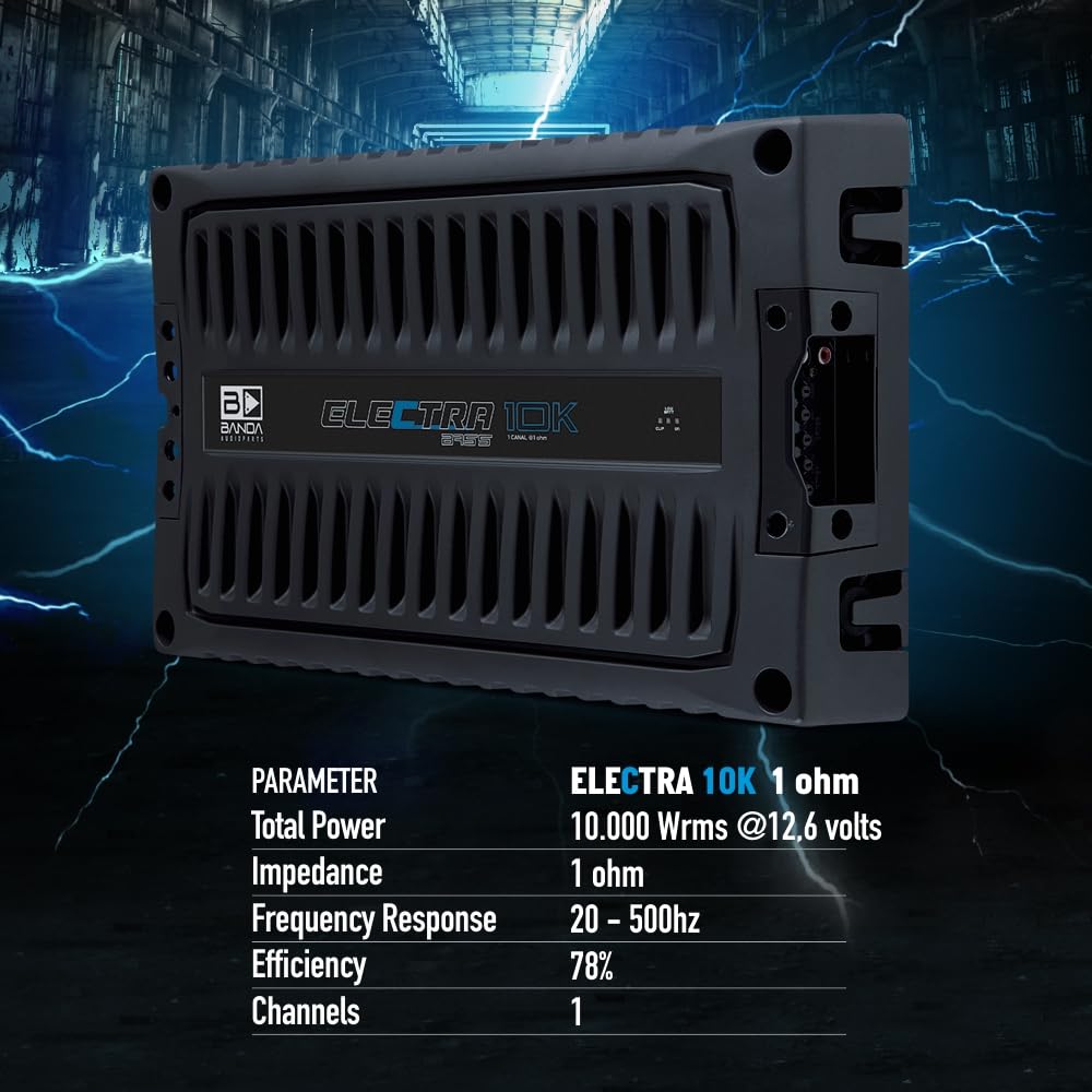BANDA Audioparts ELEC10K.1OHM Electra Bass Amp 10K - 1 Ohm Digital Amplifier 10000 Watts Rms 1-Channel Full Range || GENERAL || Brand : BANDA Audioparts || Model Number : ELEC10K.1OHM || UPC : 7898713131691 || BANDA ELECTRA AMPLIFIER MODULE 10000 WATT BASS AMP @ 1 OHM || The ELECTRA line was developed especially for those looking for incomparable bass. || || It has a frequency response of 22Hz to 1000Hz. Due to this, the ELECTRA will only play Subwoofers, Bass and Woofers. The variable BASS BOOST feature 30 - 80hz by up to 12dB is a differentiator, further reinforcing the bass of your system. Designed on a bold 100% aluminum chassis, it works with a power of 10000 WRMS with 1 input channel for connection and an impedance of 1 Ohm. It has very low harmonic distortion and Clipping indicator, forced ventilation and short circuit protection. || || TECHNICAL SPECIFICATIONS || - Maximum Power 12.6v @ 1 Ohm: 10000 WRMS || - Maximum Power 12.6v @ 2 Ohms: 8000 WRMS || - Nominal Impedance Efficiency: 76% || - Input Voltage: 9 - 15V || - Input Impedance: 100K Ohms || - THD Maximum Power: