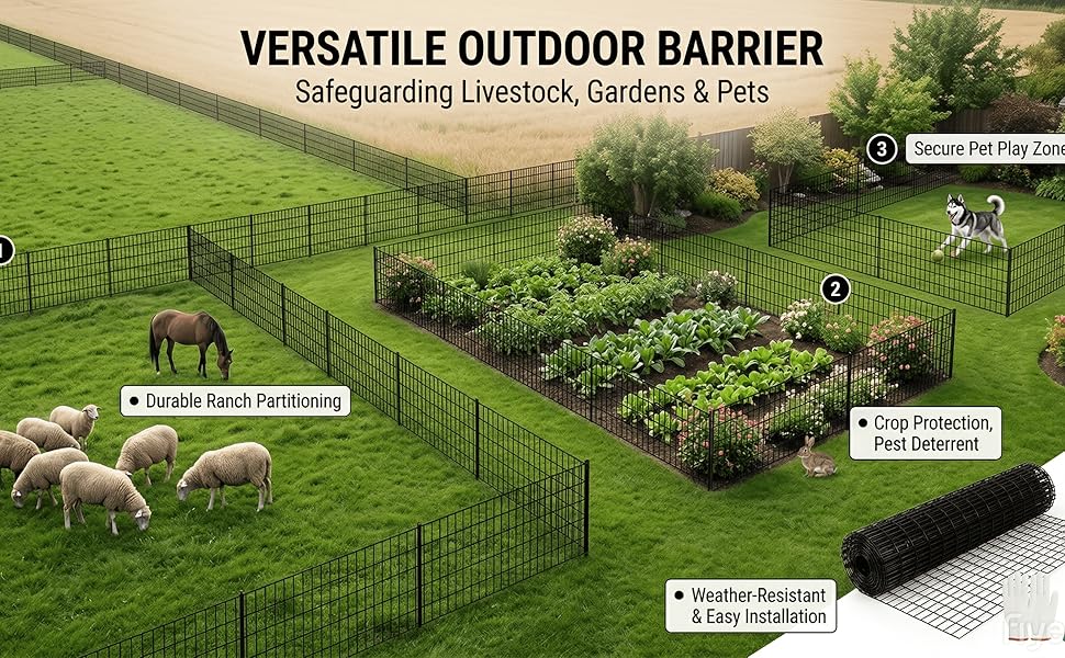 تصميم متعدد الوظائف ومرن؛ لفات بأحجام مختلفة، سهلة القطع والتشكيل لتناسب أي منطقة؛ مثالية للاستخدام كسياج للكلاب، أو سياج في الفناء، أو حظائر الدجاج، أو حظائر حديقة الخضروات، أو مسارات الأرانب.