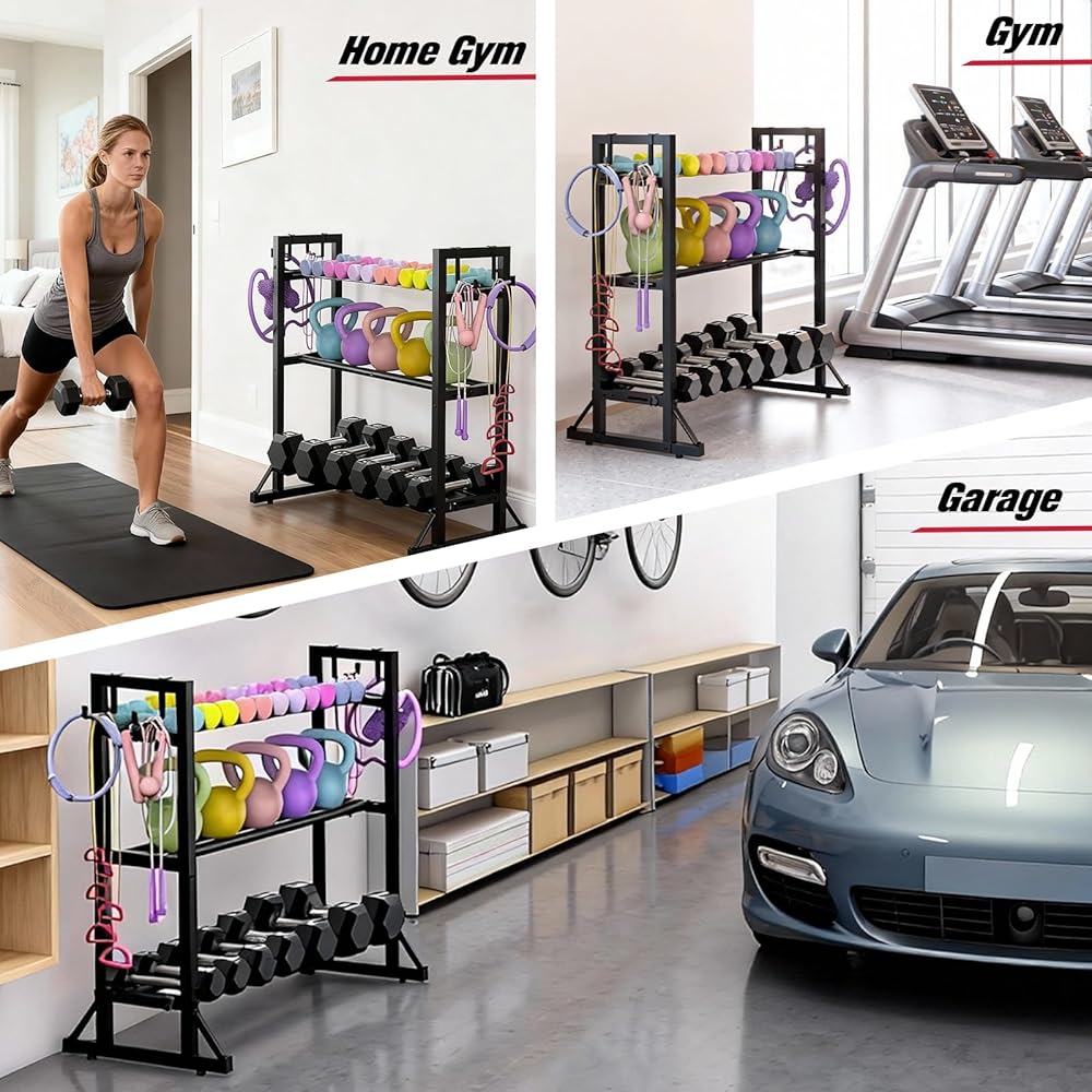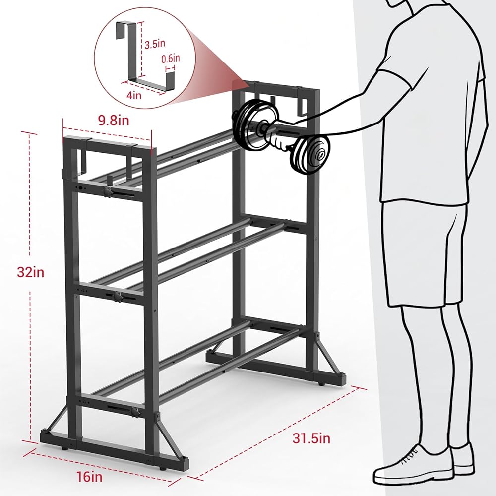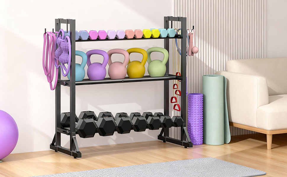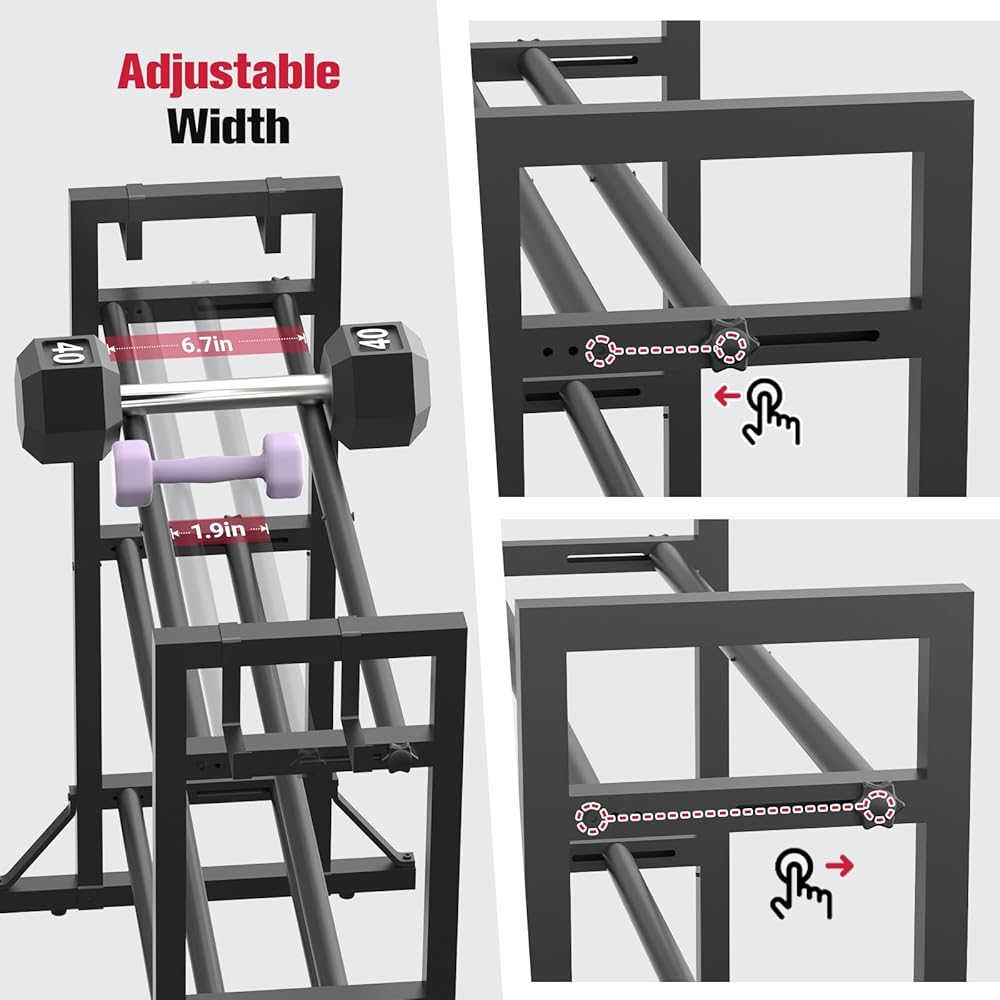 Fully Adjustable Fit: 3 adjustable tiers + horizontal bars that widen from 1.9" to 6.7" per shelf. Holds everything from small 5-lb weights to bulky 50-lb dumbbells and kettlebells.