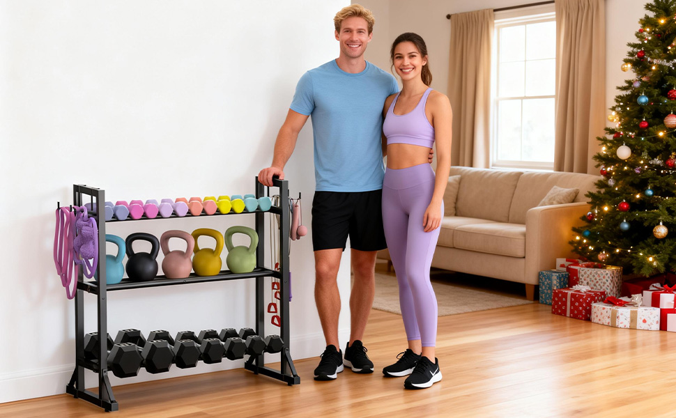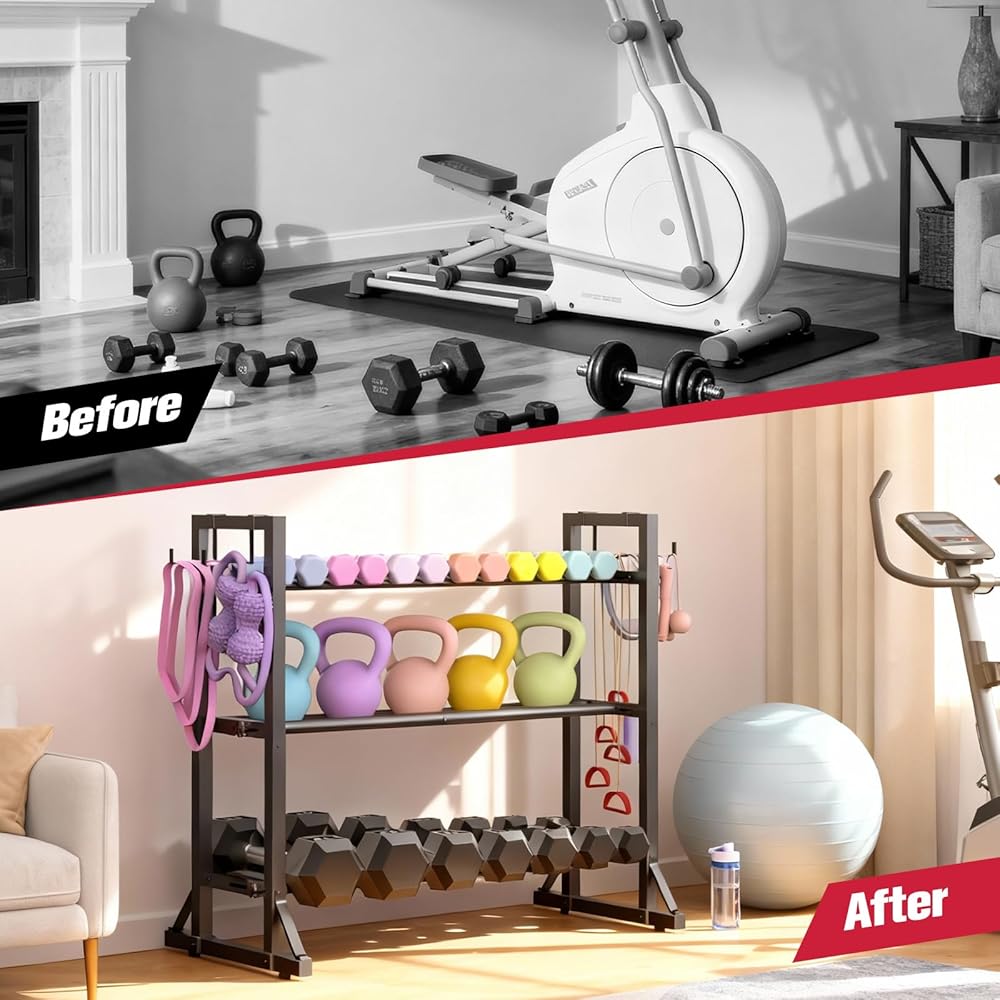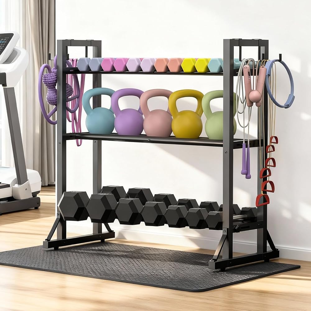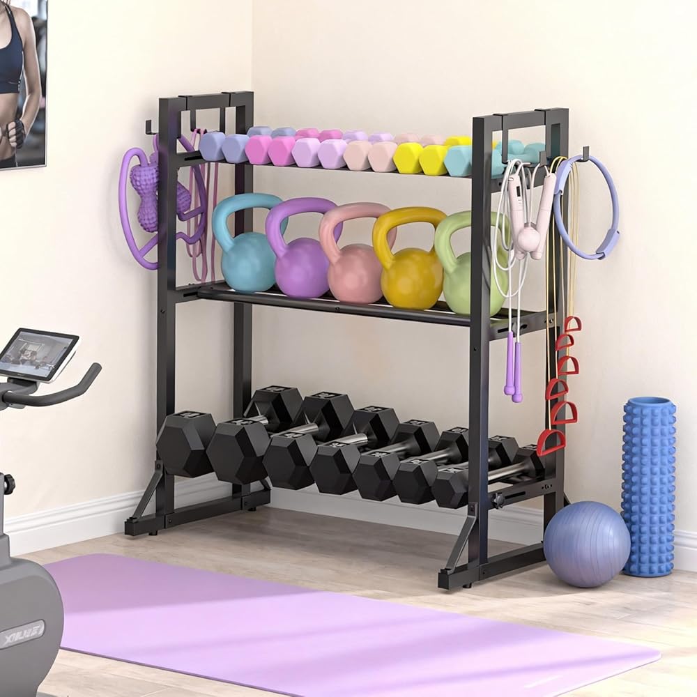 Fully Adjustable Fit: 3 adjustable tiers + horizontal bars that widen from 1.9" to 6.7" per shelf. Holds everything from small 5-lb weights to bulky 50-lb dumbbells and kettlebells.